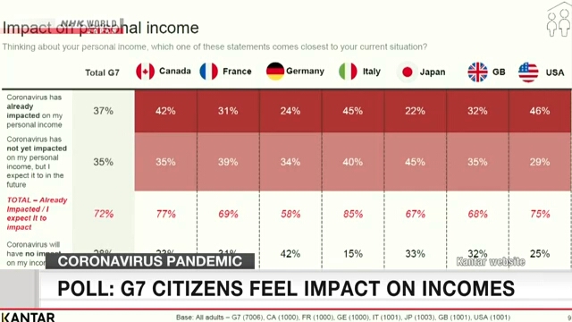 ผลการสำรวจออนไลน์ชี้ว่า ประชาชนของกลุ่มประเทศอุตสาหกรรมชั้นนำของโลก 7 ชาติ หรือ G7 เฉลี่ยแล้วร้อยละ 37 ระบุว่ารายได้ของตนได้รับผลกระทบจากการระบาดใหญ่ของไวรัสโคโรนาสายพันธุ์ใหม่