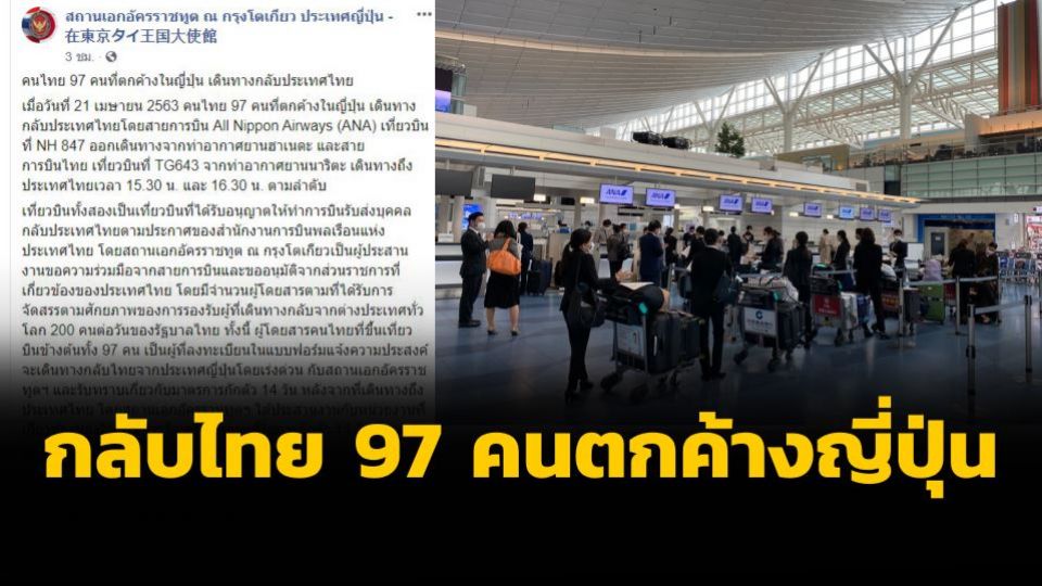 สถานเอกอัครราชทูต ณ กรุงโตเกียวโพสต์ข้อความผ่านทางเฟซบุ๊ก ระบุว่า วันนี้(21 เม.ย.) คนไทย 97 คนที่ตกค้างในญี่ปุ่นจะเดินทางกลับประเทศไทยโดยสายการบิน All Nippon Airways (ANA) เที่ยวบินที่ NH 847 ออกเดินทางจากท่าอากาศยานฮาเนดะ และสายการบินไทย เที่ยวบินที่ TG643 จากท่าอากาศยานนาริตะ ถึงประเทศไทยเวลา 15.30 น. และ 16.30 น. ตามลำดับ