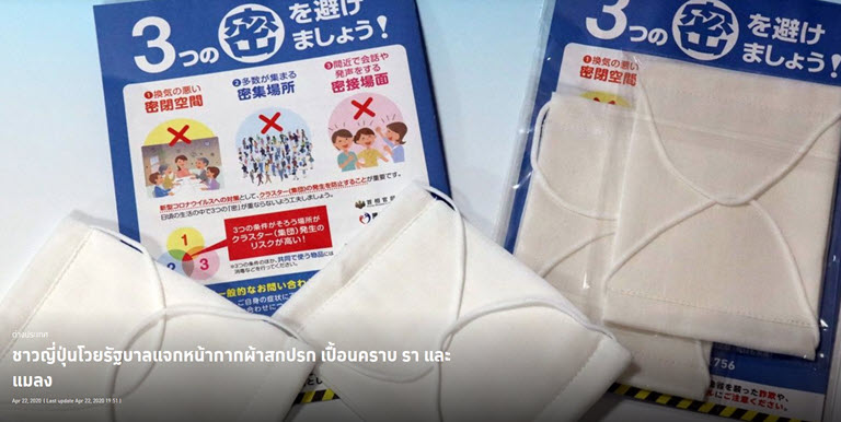 เพียง 1 สัปดาห์หลังรัฐบาลญี่ปุ่นเริ่มแจกจ่ายหน้ากากที่สามารถซักและใช้ซ้ำได้ให้ประชาชน ครอบครัวละ 2 ชิ้น ซึ่งใช้งบประมาณ 430 ล้านดอลลาร์สหรัฐฯ ในยุทธศาสตร์ควบคุมการระบาดของไวรัส ล่าสุด รัฐบาลญี่นก็จำเป็นต้องหาหน้ากากชิ้นใหม่เปลี่ยนให้กับประชาชนบางส่วน หลังมีรายงานว่าหน้ากากบางชิ้นที่แจกไปนั้นไม่สะอาด เปื้อนทั้งคราบ ราและแมลง