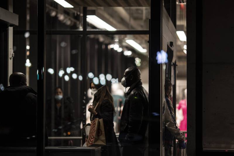 นางแนนซี เปโลซี ประธานสภาผู้แทนราษฎรสหรัฐ ใช้ผ้าพันคอปิดปากและจมูกเมื่อเดินทางมายังสภา