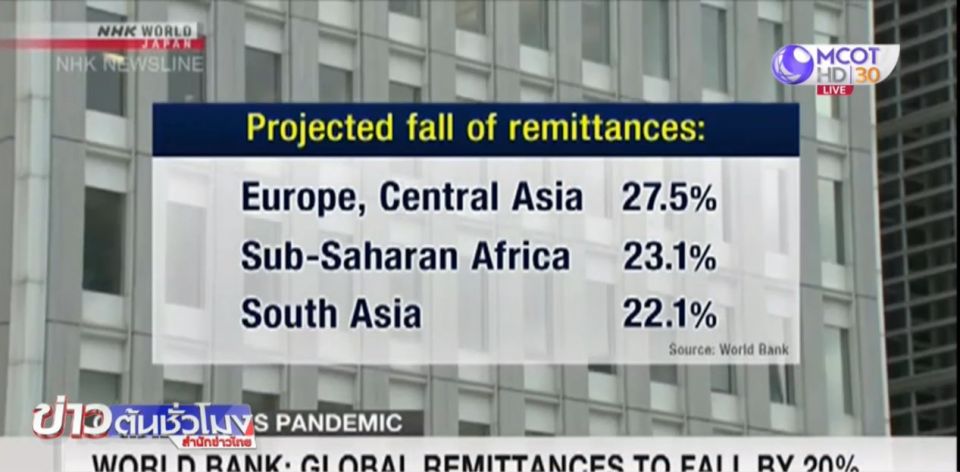 24 เม.ย. – ธนาคารโลกเผยการส่งเงินกลับประเทศของแรงงานต่างด้าวในประเทศต่าง ๆ ทั่วโลก มีแนวโน้มหดตัวราวร้อยละ 20 ในปีนี้ จากวิกฤติเศรษฐกิจที่มีต้นตอจากการระบาดของไวรัสสายพันธุ์ใหม่ ที่ทำให้ค่าจ้างและการจ้างงานแรงงานต่างด้าวลดลง