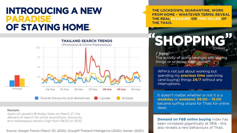 จากการเก็บข้อมูลพฤติกรรมผู้บริโภคเชิงคุณภาพของ Group M กับผู้บริโภคชาวไทยทั่วประเทศพบว่าคนไทยเริ่มมีความตระหนักและมีการกล่าวถึงโคโรนาไวรัสตั้งแต่ช่วงเดือนมกราคมโดยเฉพาะบนสื่อโซเชียลมีเดีย โดยมีการพูดถึงมากขึ้นภายหลังจากที่มีการเรียกชื่อไวรัสนี้ใหม่เป็น COVID-19 และมีความตื่นตัวหลังจากมีข่าวผู้เสียชีวิตรายแรก
