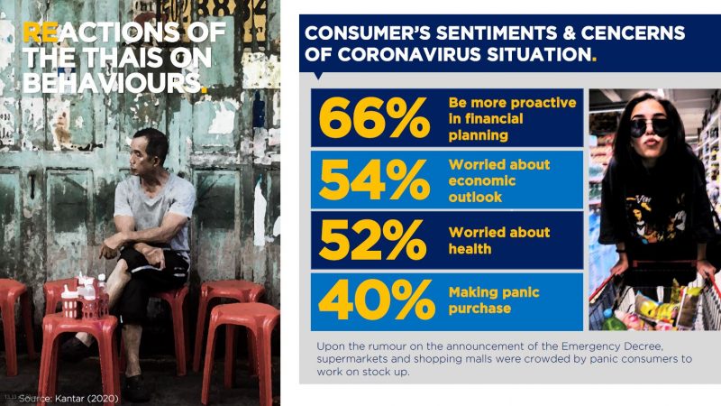 สำหรับมาตรการและเหตุการณ์ข้างต้นที่ทางรัฐบาลได้ออกมาเพื่อควบคุมการแพร่ระบาดของไวรัสนั้น ได้ส่งผลโดยตรงต่อการหยุดชะงักของกลไกต่างๆ ของประเทศ ทั้งในแง่เศรษฐกิจและการใช้ชีวิตของผู้บริโภค จากผลวิจัยโดยคันทาร์พบว่าคนไทยมีความกังวลมากขึ้นในเรื่องของความปลอดภัยและสถานภาพทางการเงินของตัวเองมากขึ้น โดย
