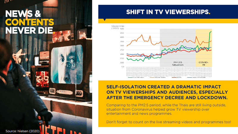 อีกหนึ่งพฤติกรรมที่น่าสนใจของคนไทยภายหลังจากการที่ภาครัฐและเอกชนส่วนใหญ่ได้ร่วมมือกันรณรงค์ให้ประชาชนกักตัวและทำงานจากที่บ้านพบว่าพฤติกรรมของผู้บริโภคมีความเปลี่ยนแปลงในการใช้เวลาบนแพลตฟอร์มทั้งแบบออฟไลน์และออนไลน์มากขึ้นอย่างเห็นได้ชัด โดยเฉพาะเมื่อเทียบกับสถานการณ์ก่อนหน้าอย่างเช่น เรื่องของฝุ่น PM2.5