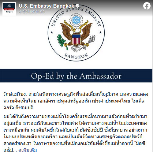 สถานทูตสหรัฐฯ ประจำประเทศไทยเผยแพร่บทความการแสดงความเห็นของนายไมเคิล จอร์จ ดีซอมบรี เอกอัครราชทูตสหรัฐอเมริกาประจำประเทศไทย เรื่องแม่น้ำโขงว่า แม่น้ำโขงเปรียบเสมือนสายโลหิตทางเศรษฐกิจที่หล่อเลี้ยงประชาชนในภูมิภาคลุ่มแม่น้ำโขงและแม่น้ำโขงไม่ใช่สมบัติของประเทศใดประเทศหนึ่ง พร้อมทั้งเน้นย้ำสหรัฐฯ พร้อมสนับสนุนการจัดการทรัพยากรน้ำในแม่น้ำโขง รวมทั้งพร้อมแบ่งปันข้อมูลทรัพยากรน้ำในแม่น้ำโขงให้กับประเทศไทยและประเทศในลุ่มน้ำโขงตอนล่าง