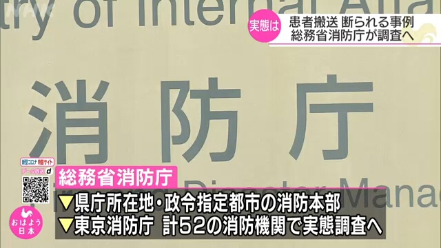 หน่วยงานด้านการจัดการภัยพิบัติและอัคคีภัยจะสำรวจหน่วยดับเพลิง 52 หน่วยในกรุงโตเกียวและเมืองใหญ่แห่งอื่น ๆ การสำรวจดังกล่าวจะสอบถามหน่วยดับเพลิงเหล่านั้นว่ามีกี่ครั้งที่รถพยาบาลของพวกเขาถูกโรงพยาบาล 4 แห่งหรือมากกว่านั้นปฏิเสธ
