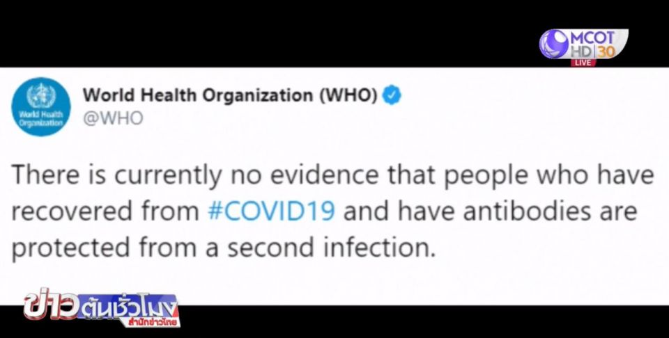 สำนักงานองค์การอนามัยโลก ที่นครเจนีวา สวิตเซอร์แลนด์ทวีตเมื่อวานนี้ว่า ไม่มีหลักฐานใดๆ ยืนยันว่าผู้ที่หายป่วยจากโควิด-19 จะมีแอนติบอดีหรือภูมิคุ้มกันทำให้ไม่กลับมาเป็นอีก เตือนการออกใบรับรองให้ผู้ที่หายป่วยจากโควิด-19 ว่าจะไม่เป็นผู้เสี่ยงต่อการติดเชื้อและกลับไปทำงานได้นั้น เป็นเรื่องที่ต้องระวังเป็นอย่างยิ่ง
