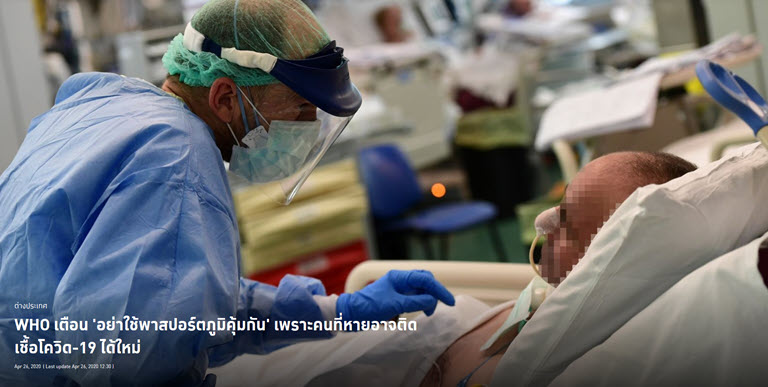 องค์การอนามัยโลกเตือนรัฐบาลทั่วโลกว่า ไม่ควรใช้ ‘พาสปอร์ตภูมิคุ้มกัน’ เพราะขณะนี้ยังไม่มีหลักฐานว่าผู้ที่หายจากโควิด-19 จะมีภูมิคุ้มกันไม่ให้ติดเชื้อซ้ำอีกรอบ