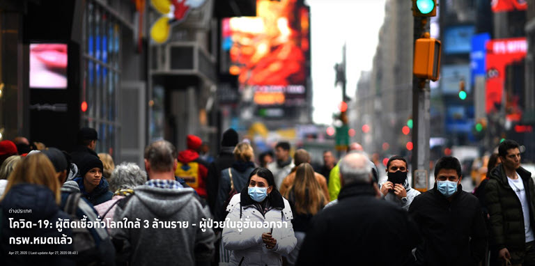 27 เม.ย. เว็บไซต์ worldometers รายงานว่า ยอดผู้ติดเชื้อทั่วโลกเพิ่มขึ้นถึง 2,994,436 ราย ขณะที่ยอดผู้เสียชีวิตจากการติดเชื้อทั่วโลกเพิ่มขึ้นถึง 206,973 ราย โดยมีสหรัฐฯ ที่มีผู้ติดเชื้อมากที่สุดถึง 987,160 ราย ขณะที่ผู้เสียชีวิตในสหรัฐฯก็เพิ่มขึ้นถึง 55,413 ราย