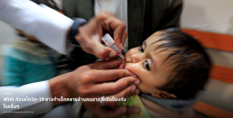 ผู้อำนวยการใหญ่องค์การอนามัยโลกเผยว่าจนถึงตอนนี้มีประชาชนประมาณ 13 ล้านคนทั่วโลกที่ได้รับผลกระทบจากความล่าช้าของโครงการให้วัคซีนตามปกติ ทั้งวัคซีนป้องกันโรคโปลิโอ โรคหัด อหิวาตกโรค ไข้เหลืองและโรคเยื่อหุ้มสมองอักเสบ พร้อมเรียกร้องประเทศสมาชิกให้ช่วยกันรับรองว่าโครงการวัคซีนจะได้รับเงินสนับสนุนอย่างเต็มที่