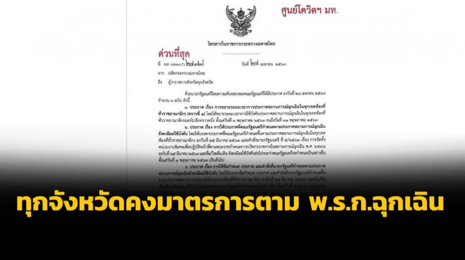 ขอให้จังหวัดถือปฏิบัติตามประกาศดังกล่าวโดยเคร่งครัด และการออกคำสั่งหรือประกาศของจังหวัดที่เกี่ยวข้อง ให้รอการสั่งการเชิงนโยบายจากศูนย์บริหารสถานการณ์โควิด-19 หรือ ศบค.ก่อน เพื่อให้เกิดเอกภาพพร้อมกันทั่วประเทศ และมีข้อกฎหมายรองรับผู้มีส่วนเกี่ยวข้องในการปฏิบัติต่อไป.