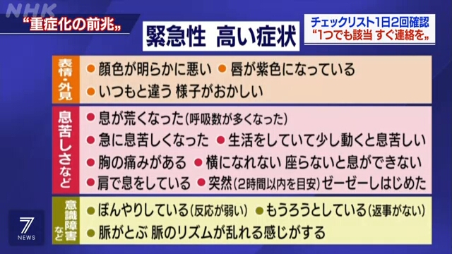 กระทรวงสาธารณสุข แรงงาน และสวัสดิการของญี่ปุ่นได้เผยแพร่รายการตรวจสอบอาการ 13 อาการที่เกิดจากไวรัสโคโรนาสายพันธุ์ใหม่ ที่จะเป็นตัวบ่งชี้ว่าผู้ที่มีอาการดังกล่าวควรปรึกษาผู้เชี่ยวชาญทางการแพทย์โดยทันที