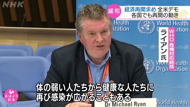 นายไมเคิล ไรอัน ผู้อำนวยการบริหารโครงการฉุกเฉินด้านสุขภาพขององค์การอนามัยโลก ระบุว่า ประเทศที่เริ่มพิจารณาผ่อนคลายมาตรการปิดเมืองจำเป็นต้องจับตาดูอย่างต่อเนื่องสำหรับการพุ่งขึ้นแบบก้าวกระโดดของยอดผู้ติดเชื้อ และพร้อมที่จะกลับมาใช้บางมาตรการอีกครั้งหากจำเป็น