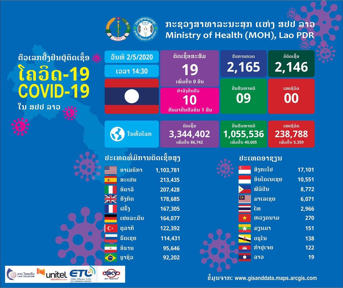 เมื่อวันที่ 2 พฤษภาคม รศ.ดร.พูทอน เมืองปาก รองรัฐมนตรีกระทรวงสาธารณสุข สปป.ลาว แถลงความคืบหน้าสถานการณ์แพร่ระบาดของเชื้อไวรัสโควิด-19 โดยระบุว่า ในวันนี้ยังไม่มีการพบผู้ติดเชื้อเพิ่มต่อเนื่องเป็นวันที่ 20 ส่งผลให้ยอดสะสมคงที่ 19 ราย มีผู้ได้รับการรักษาจนออกจากโรงพยาบาลแล้ว 9 ราย ยังรักษาตัวในโรงพยาบาล 10 ราย ทั้งหมดอาการไม่น่าเป็นห่วง