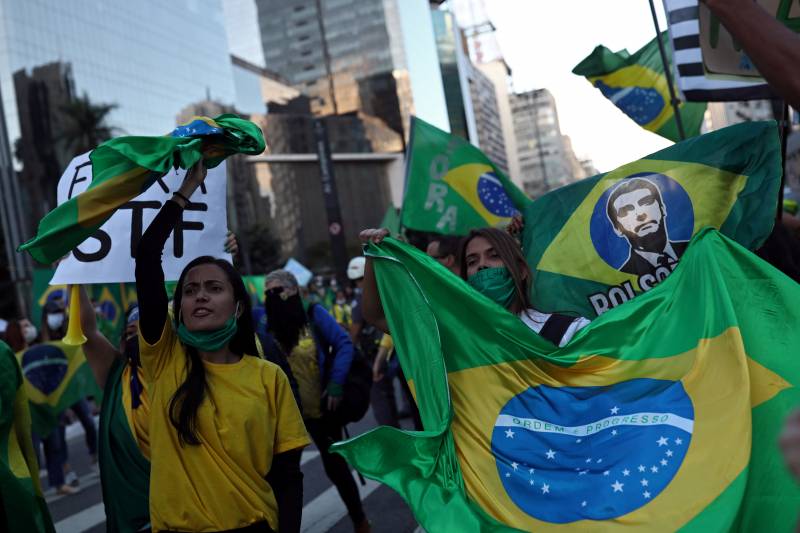 ทั้งนี้ ผู้นำบราซิลซึ่งยืนกรานว่าโรคโควิด-19 “แค่ไข้หวัดเล็กน้อย” ยังคงไม่สวมหน้ากากอนามัยหรือหน้ากากผ้าตลอดช่วงเวลาของการปราศรัย และย้ำว่าเศรษฐกิจที่ถดถอยจากมาตรการปิดเมืองนั้น “อันตรายยิ่งกว่า” เชื้อไวรัสโคโรนาสายพันธุ์ใหม่ อย่างไรก็ตาม โบลโซนาโรรักษาระยะห่างประมาณ 2 เมตร จากกลุ่มผู้สนับสนุนซึ่งมารวมตัวหน้าทำเนียบประธานาธิบดี
