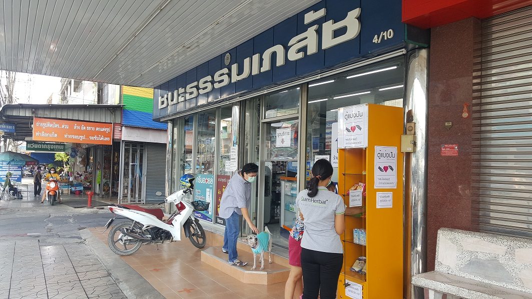 ผู้จะมาซื้อยา มีจุดยืนต้องเว้นระยะห่าง มีเจลล้างมือ ต้องสามหน้ากากอนามัย ทางร้านเข้าใจความทุกข์ลำบากในช่วงวิด จึงคิดแบ่งปันด้วยใจ