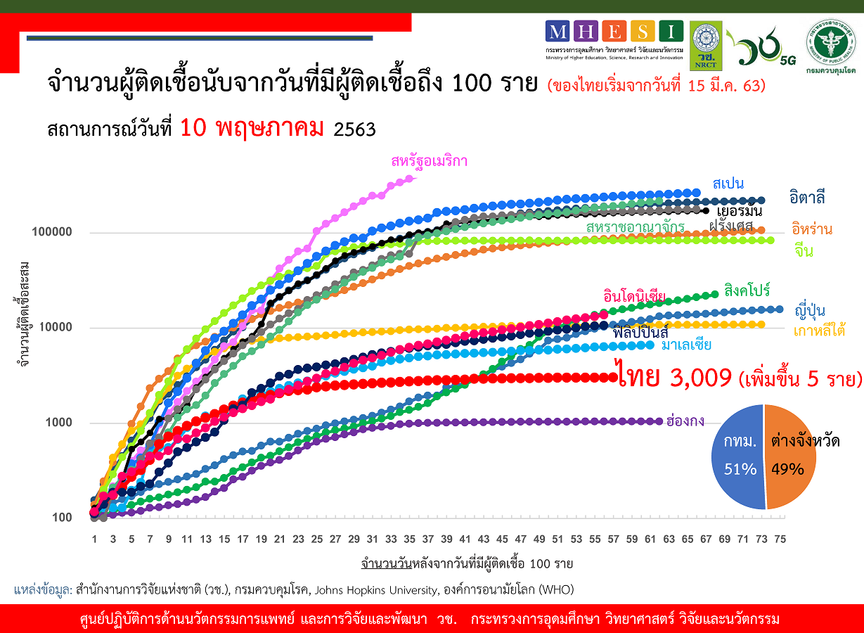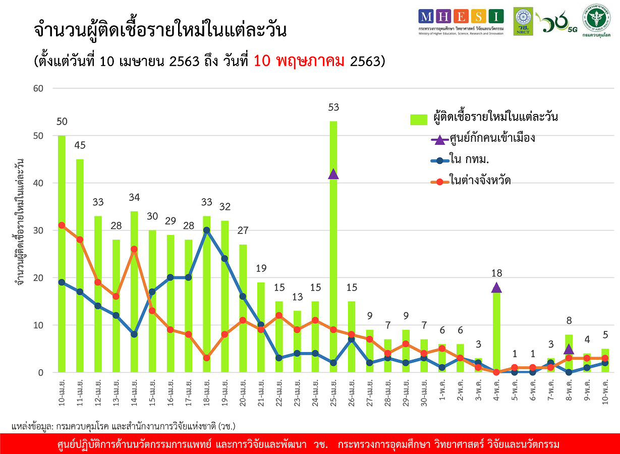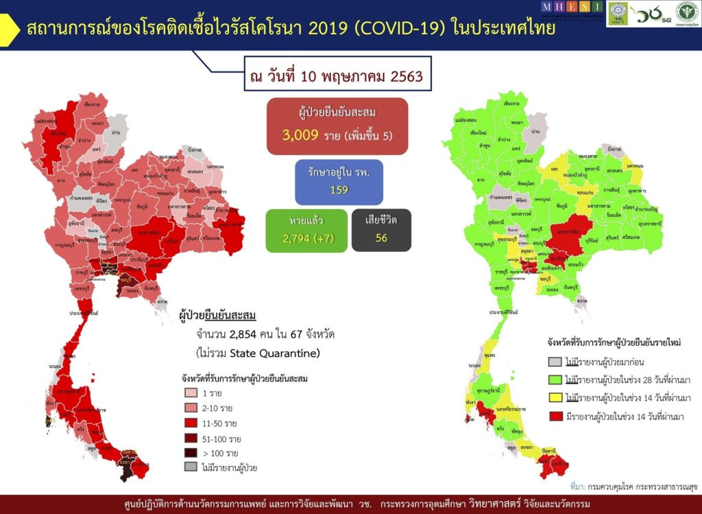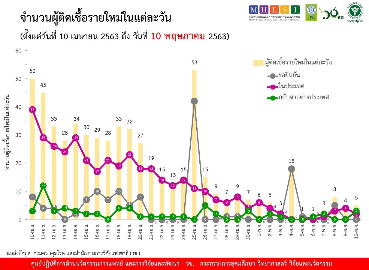 โควิด-19 เมื่อวันที่ 10 พฤษภาคม ศูนย์ปฏิบัติการด้านนวัตกรรมการแพทย์ และการวิจัยและพัฒนา สำนักงานการวิจัยแห่งชาติ (วช.) กระทรวงการอุดมศึกษา วิทยาศาสตร์ วิจัย และนวัตกรรม (อว.) ร่วมกับกรมควบคุมโรค กระทรวงสาธารณสุข (สธ.) ได้ประมวลสถานการณ์โรคติดเชื้อไวรัสโคโรนา 2019 หรือ โควิด-19 ของประเทศไทย ประจำวันที่ 10 พฤษภาคม ดังนี้
