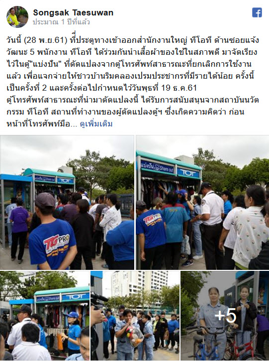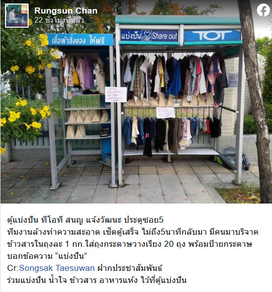 ก่อนหน้านี้ TOT ได้เคยผุดโครงการ “ตู้แบ่งปัน” ตั้งแต่ปี 2561 เริ่มต้นที่สำนักงานใหญ่ TOT ด้านซอยแจ้งวัฒนะ 5 ได้ตั้งตู้แบ่งปันที่ดัดแปลงจากตู้โทรศัพท์สาธารณะที่ยกเลิกการใช้งานแล้ว เพื่อแจกจ่ายให้ชาวบ้านริมคลองเปรมประชากรที่มีรายได้น้อย