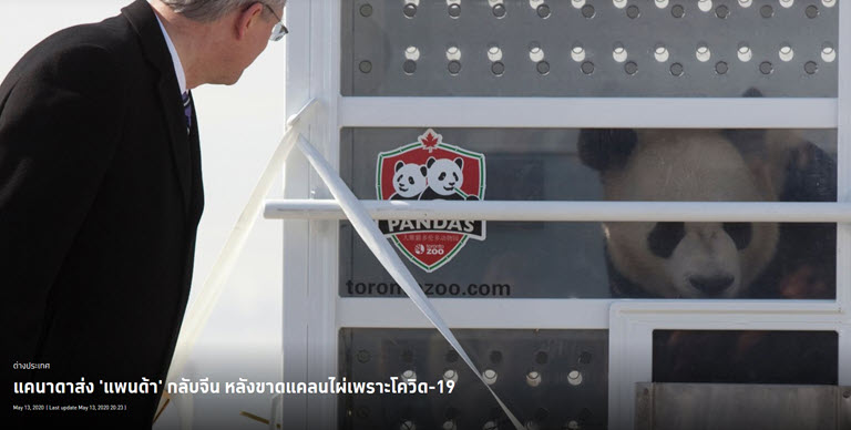 สวนสัตว์ในแคนาดาส่งแพนด้า 2 ตัวกลับจีน หลังจากขาดแคลนไผ่ เนื่องจากการขนส่งทางอากาศถูกยกเลิกในเส้นทางการบินระหว่างจีนกับแคนาดา
