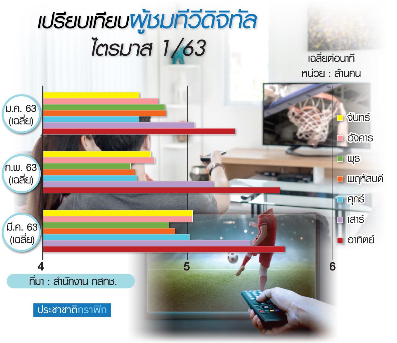 โดยเดือน มี.ค. มีผู้ชมเฉลี่ยต่อนาทีที่ 5.152 ล้านคน สูงกว่าเดือน ม.ค. และ ก.พ. ร้อยละ 5.66 และ 5.12 ตามลําดับ และจํานวนผู้ชมโทรทัศน์แบบไม่นับซ้ำ (reach) ของเดือน มี.ค. อยู่ที่ 32.30 ล้านคน สูงกว่าเดือน ม.ค. และ ก.พ. ร้อยละ 2.92 และ 1.03ตามลําดับ