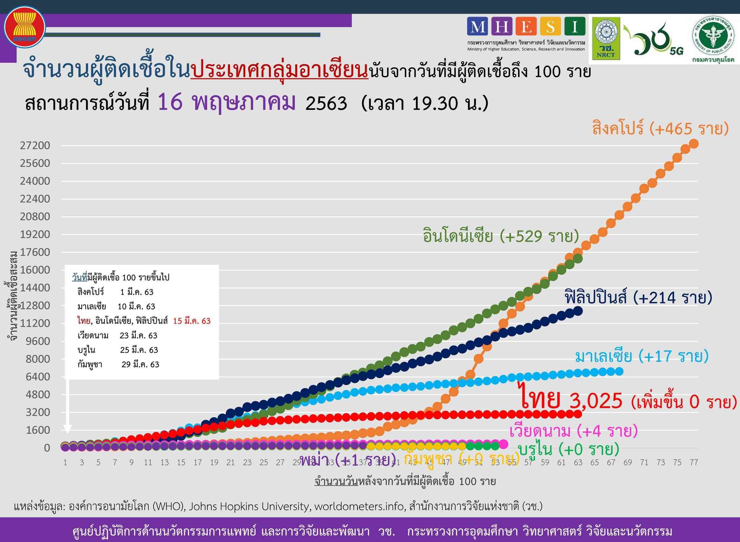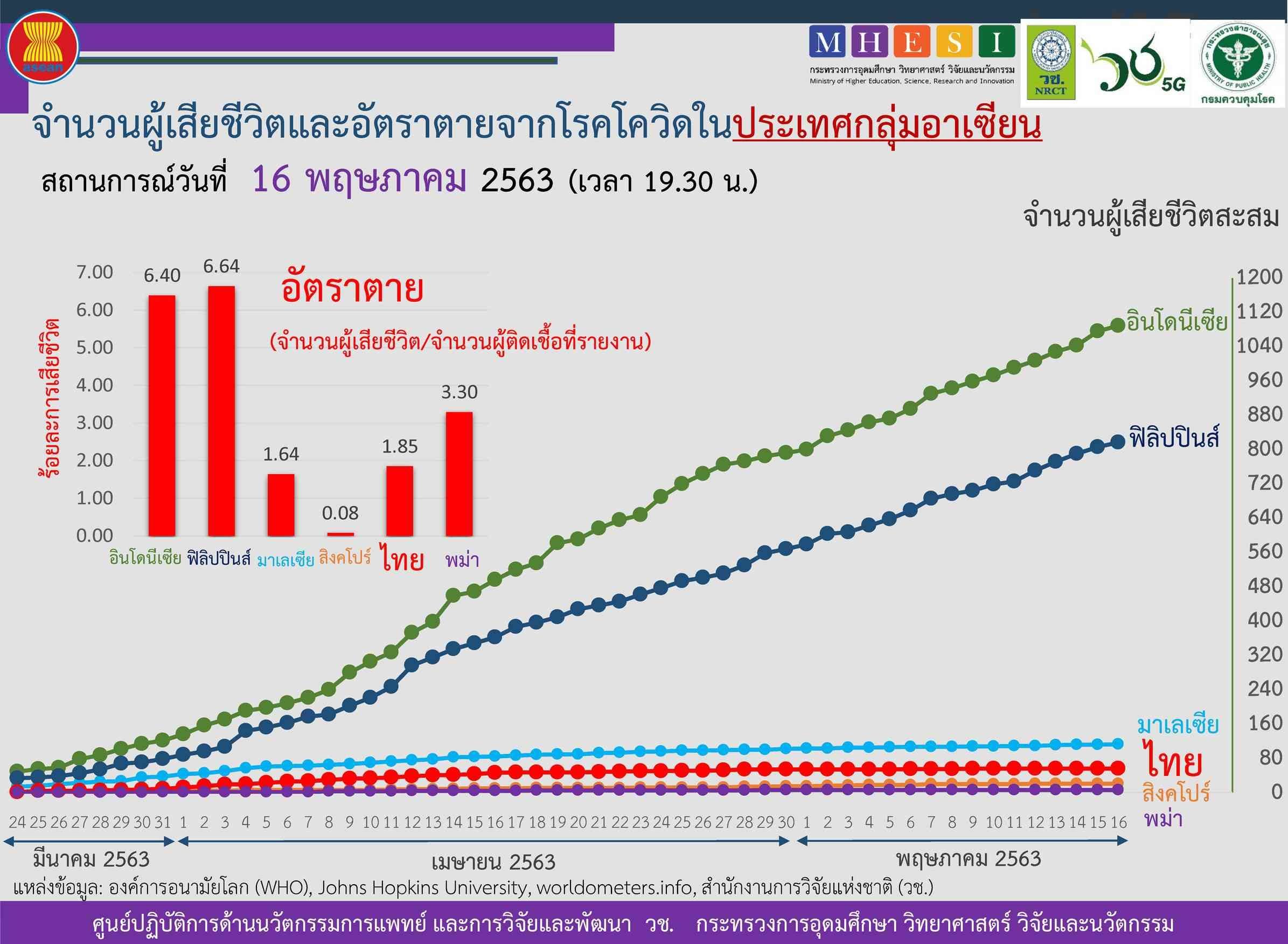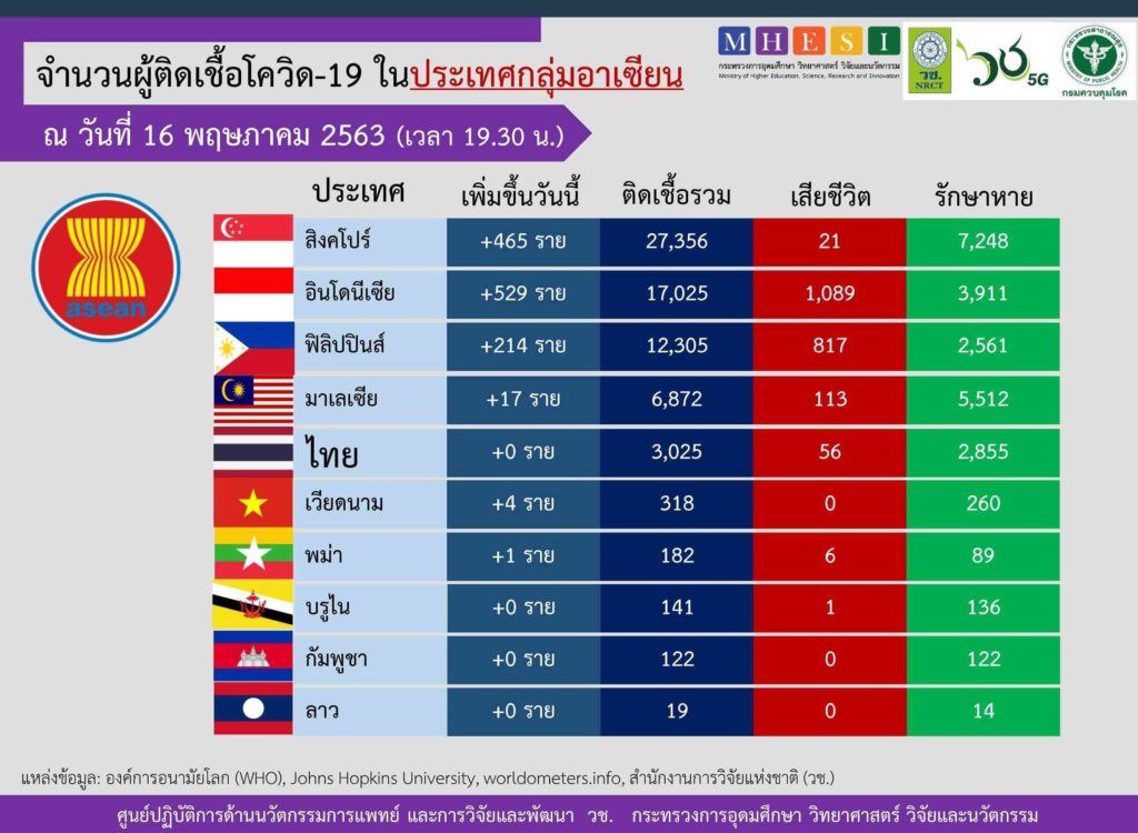 อาเซียน – เมื่อวันที่ 16 พฤษภาคม ศูนย์ปฏิบัติการด้านนวัตกรรมการแพทย์ และการวิจัยและพัฒนา สำนักงานการวิจัยแห่งชาติ (วช.) กระทรวงการอุดมศึกษาฯ (อว.) เปิดเผยสถานการณ์การติดเชื้อโควิด-19 ในอาเซียน ดังนี้