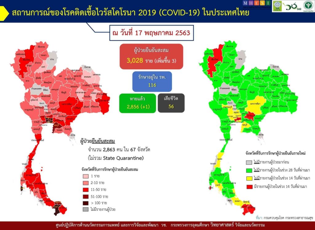 ผู้ติดเชื้อสะสม 3,028 ราย ใน 68 จังหวัด (เพิ่มขึ้นในวันนี้ 3 ราย)