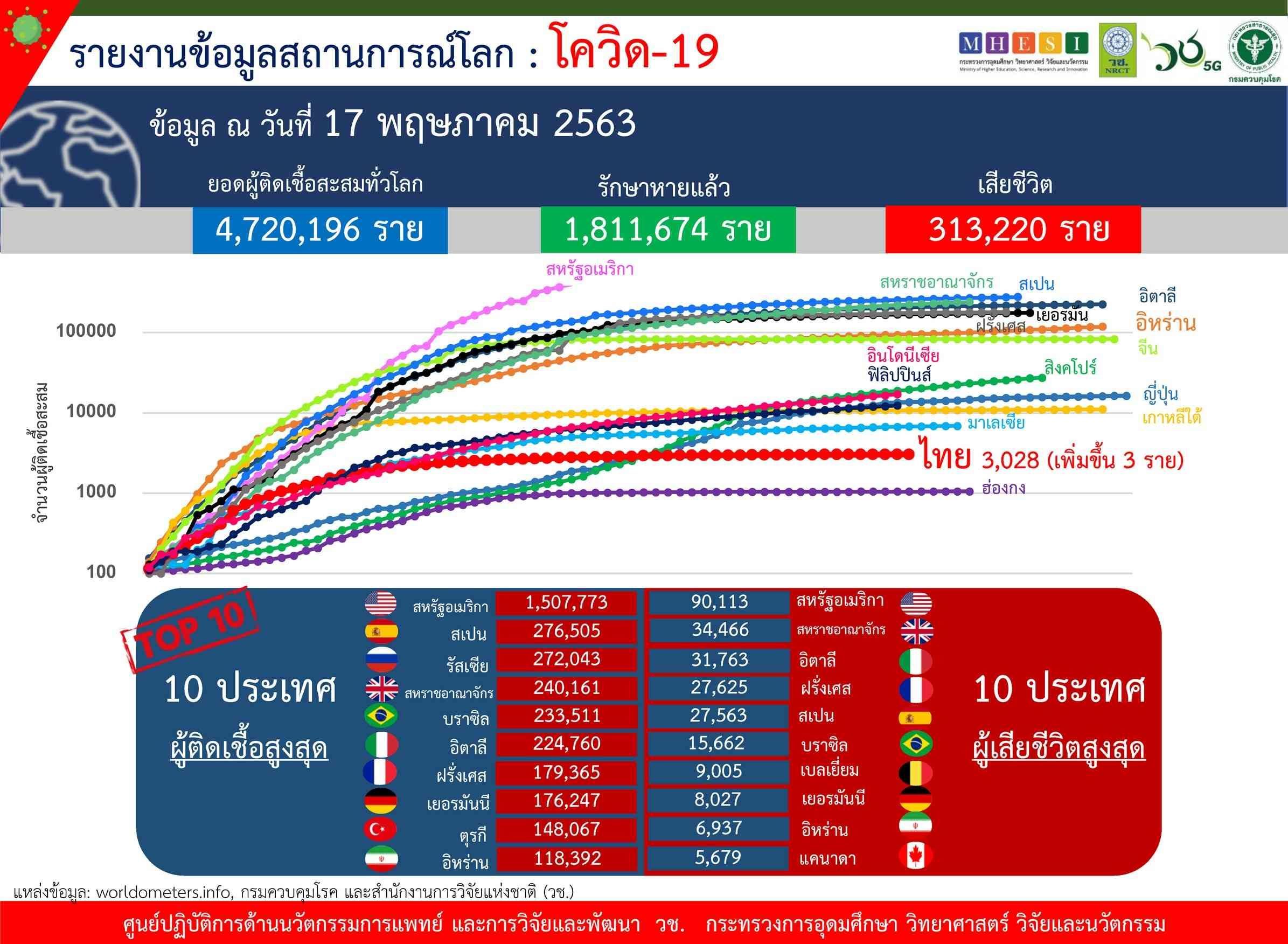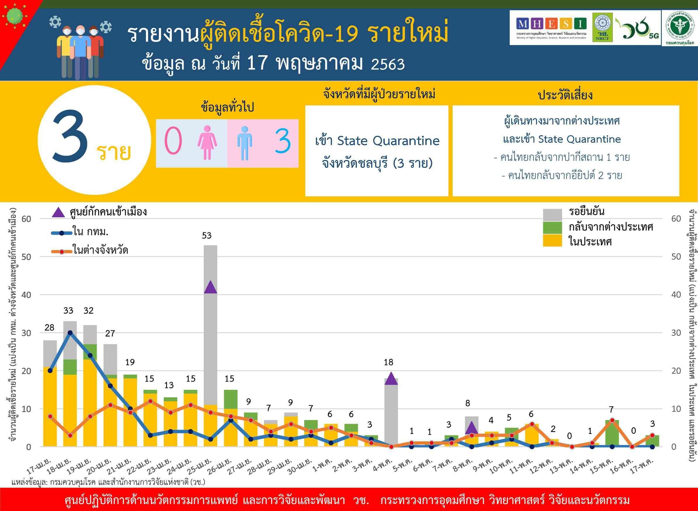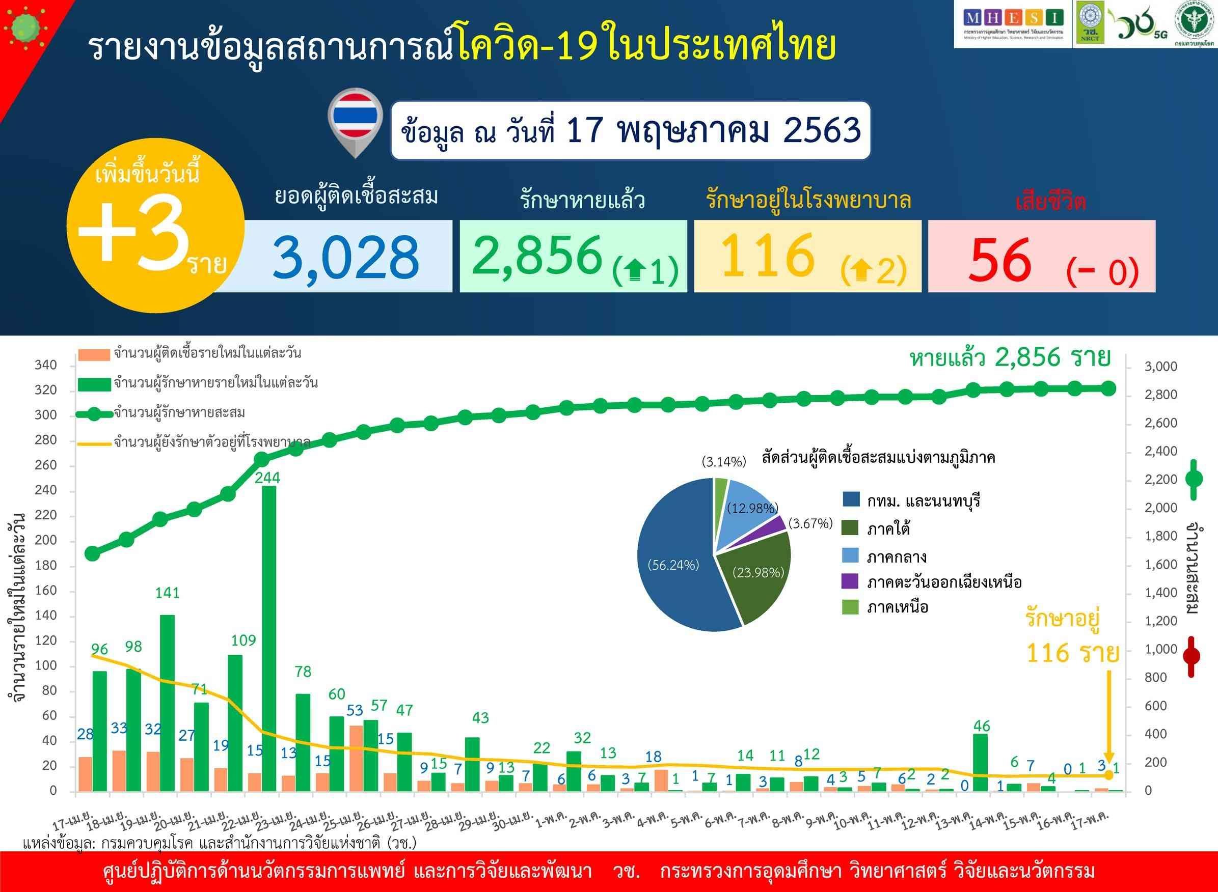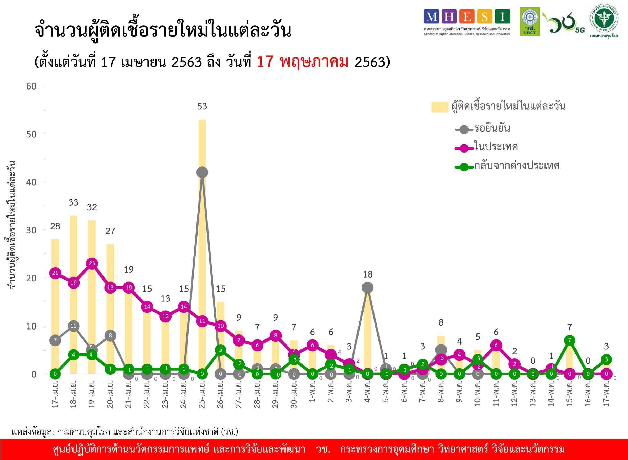 โควิด-19 เมื่อวันที่ 17 พฤษภาคม ศูนย์ปฏิบัติการด้านนวัตกรรมการแพทย์ และการวิจัยและพัฒนา สำนักงานการวิจัยแห่งชาติ (วช.) กระทรวงการอุดมศึกษาวิทยาศาสตร์วิจัย และนวัตกรรม (อว.) ร่วมกับ กรมควบคุมโรค กระทรวงสาธารณสุข (สธ.) รายงานข้อมูลสถานการณ์การโรคติดเชื้อไวรัสโคโรนา 2019 หรือ โควิด-19 ณ วันที่ 17 พฤษภาคม 2563 ดังนี้