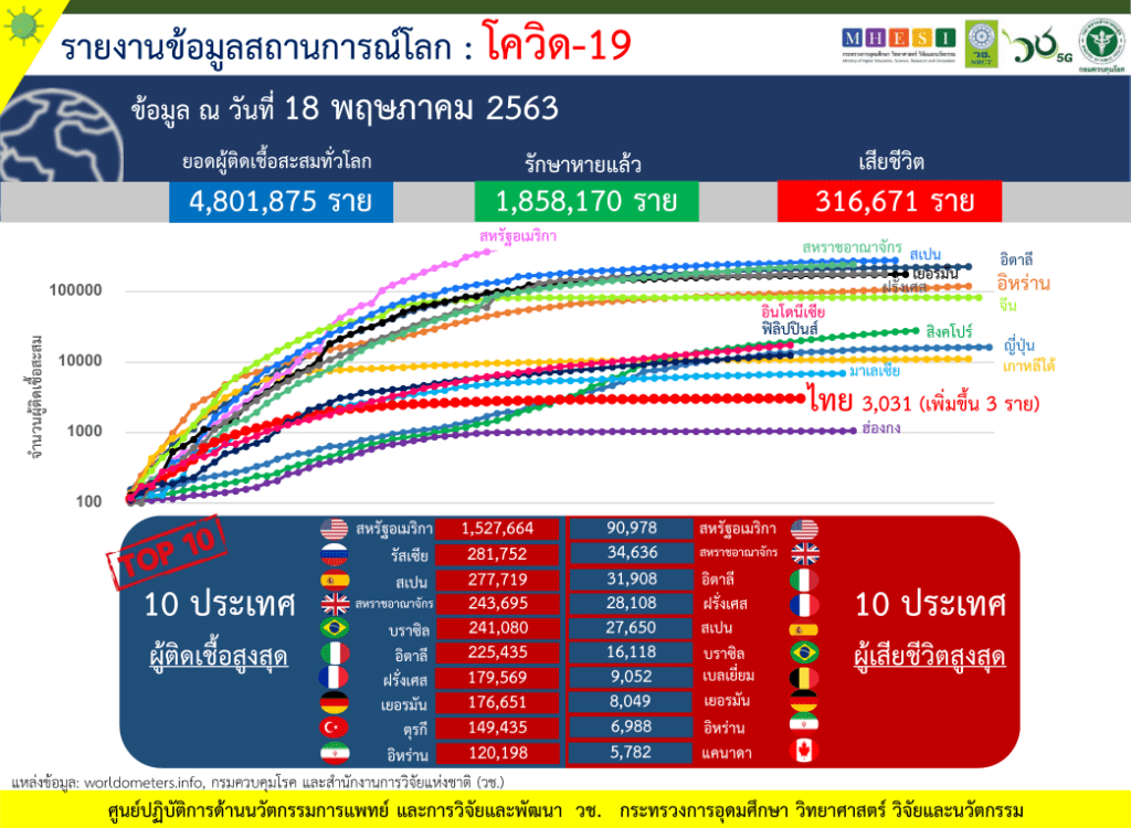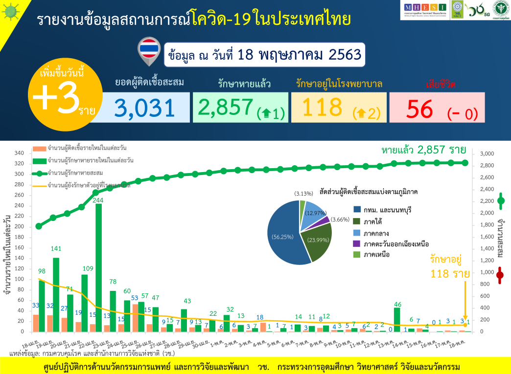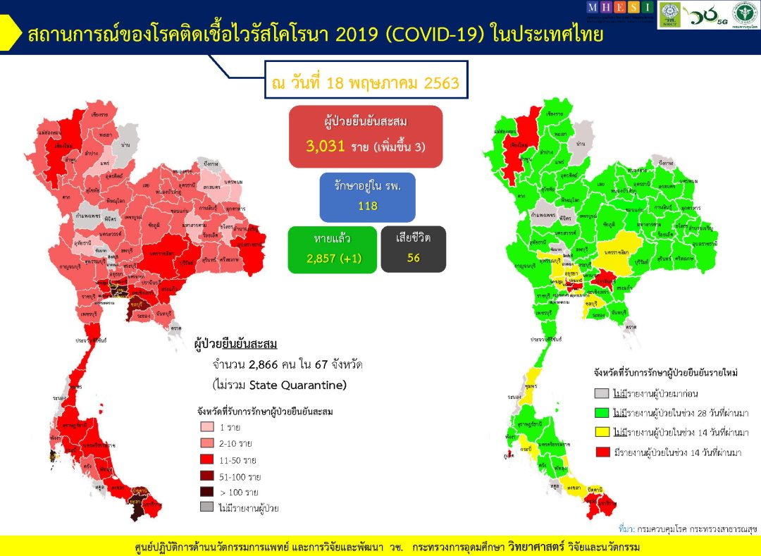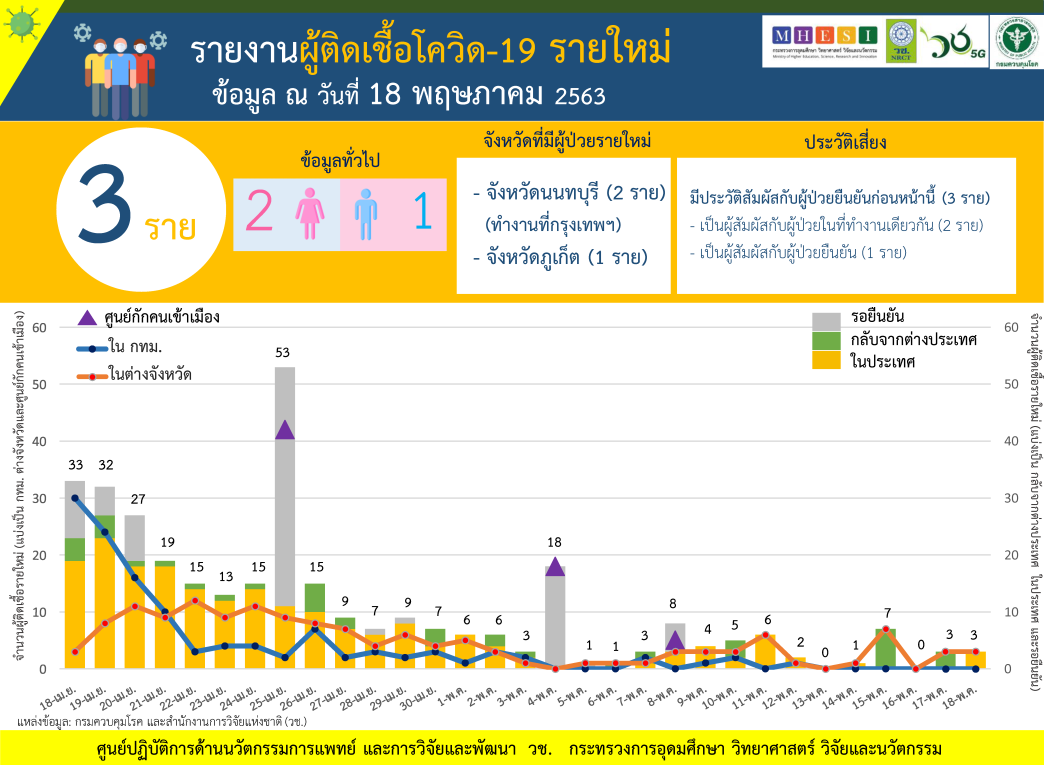 วันที่ 18 พฤษภาคม ศูนย์ปฏิบัติการด้านนวัตกรรมการแพทย์ และการวิจัยและพัฒนา สำนักงานการวิจัยแห่งชาติ (วช.) กระทรวงการอุดมศึกษา วิทยาศาสตร์ วิจัย และนวัตกรรม (อว.) ร่วมกับกรมควบคุมโรค กระทรวงสาธารณสุข(สธ.) รายงานข้อมูลสถานการณ์การติดเชื้อโควิด-19 ณ วันจันทร์ที่ 18 พฤษภาคม 2563 ดังนี้
