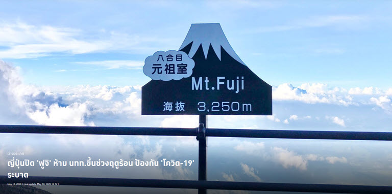 ภูเขาไฟฟูจิถูกสั่งปิดครั้งแรกในรอบ 60 ปี งดบริการนักท่องเที่ยวที่ต้องการขึ้นไปบนยอดเขาช่วงฤดูร้อนปีนี้ โดยหน่วยงานท้องถิ่นให้เหตุผล เพื่อป้องกันการแพร่ระบาดของเชื้อไวรัสโคโรนา 2019