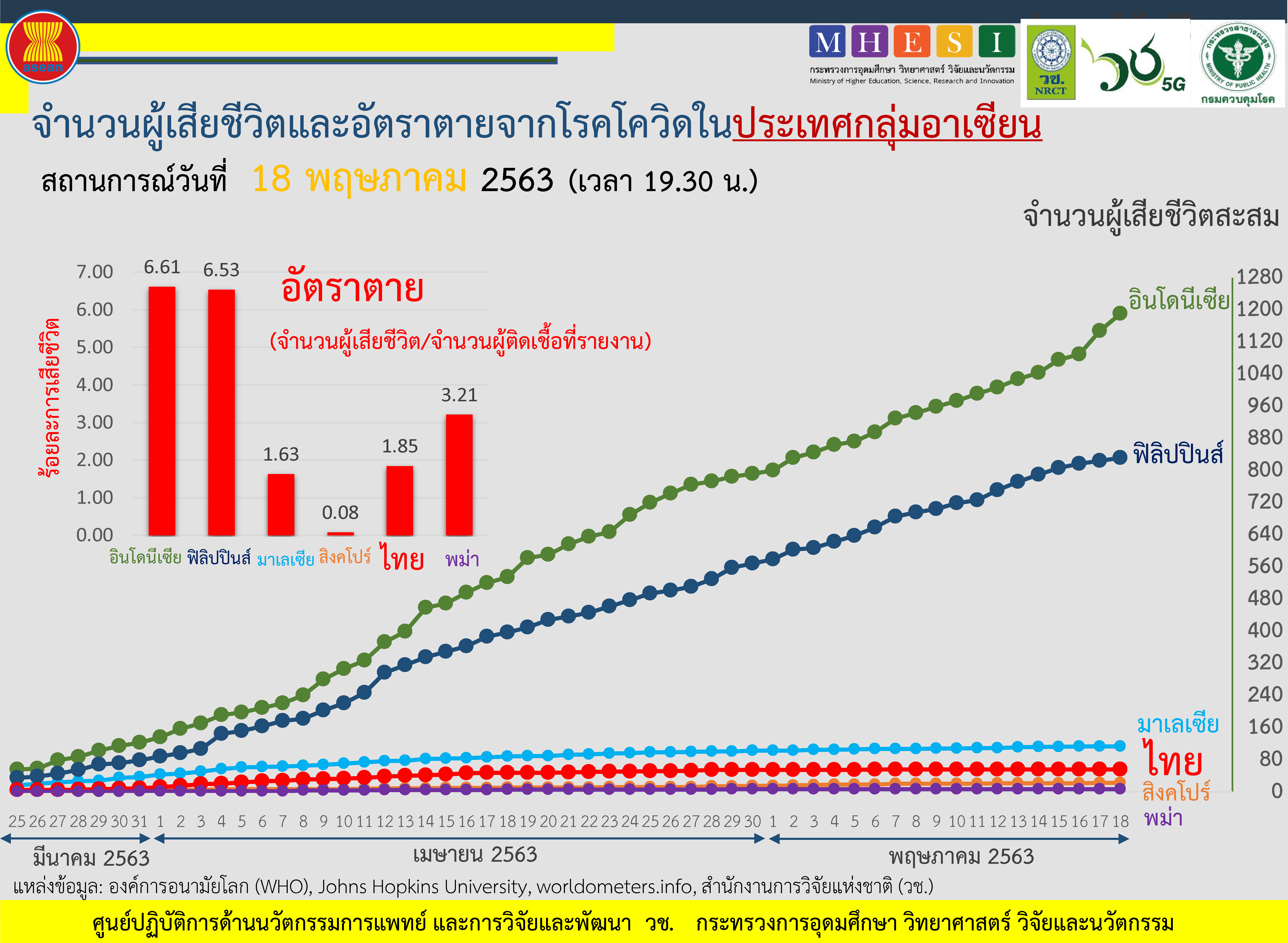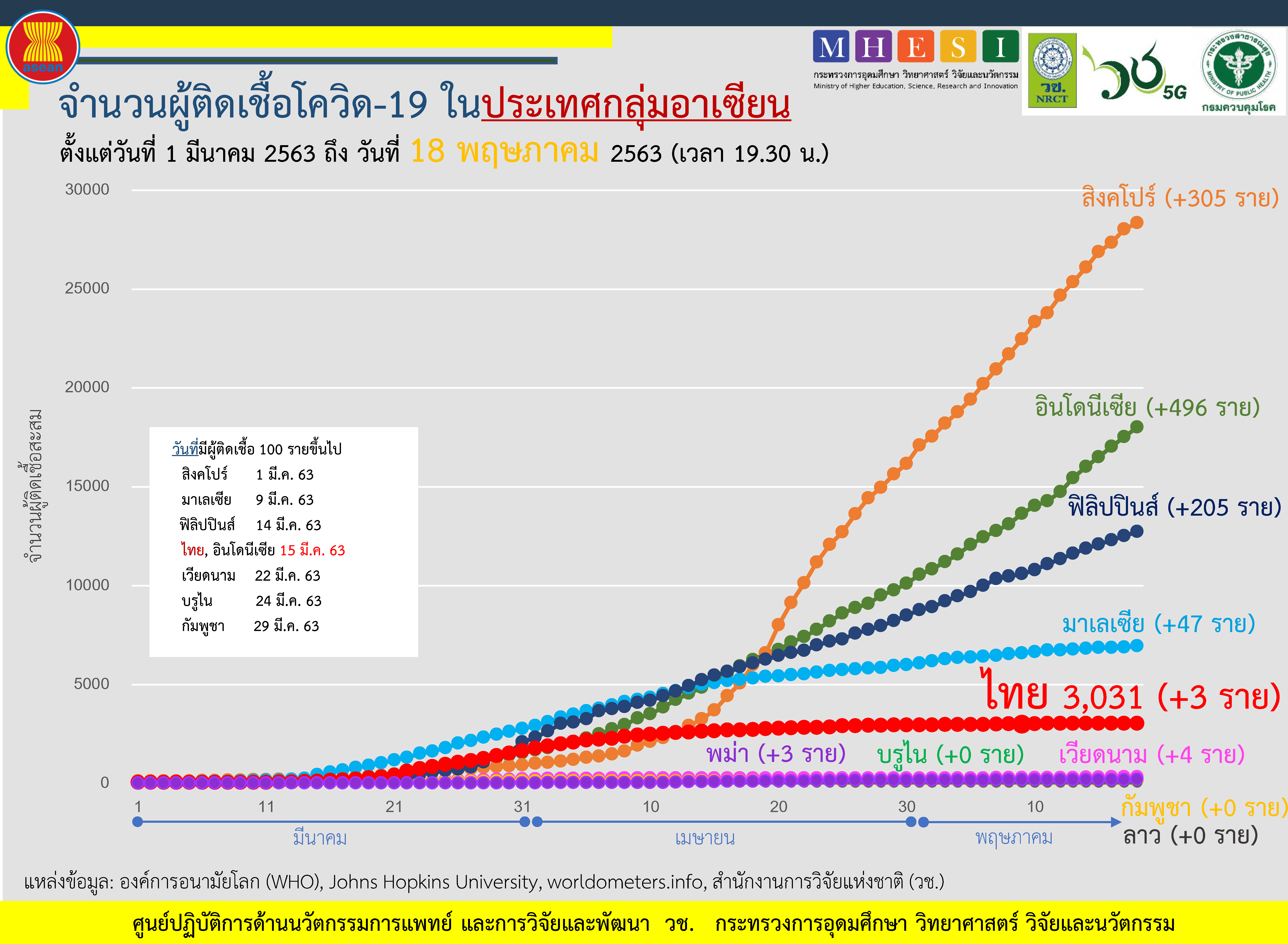 เมื่อเวลา 19.30 น.วันที่ 18 พ.ค.ศูนย์ปฏิบัติการด้านนวัตกรรมการแพทย์ และการวิจัยและพัฒนา สำนักงานการวิจัยแห่งชาติ (วช.) กระทรวงการอุดมศึกษาฯ (อว.) ได้รายงานสถานการณ์การติดเชื้อโควิด-19 ในอาเซียน พบผู้ติดเชื้อที่เพิ่มขึ้น ในแต่ละประเทศ