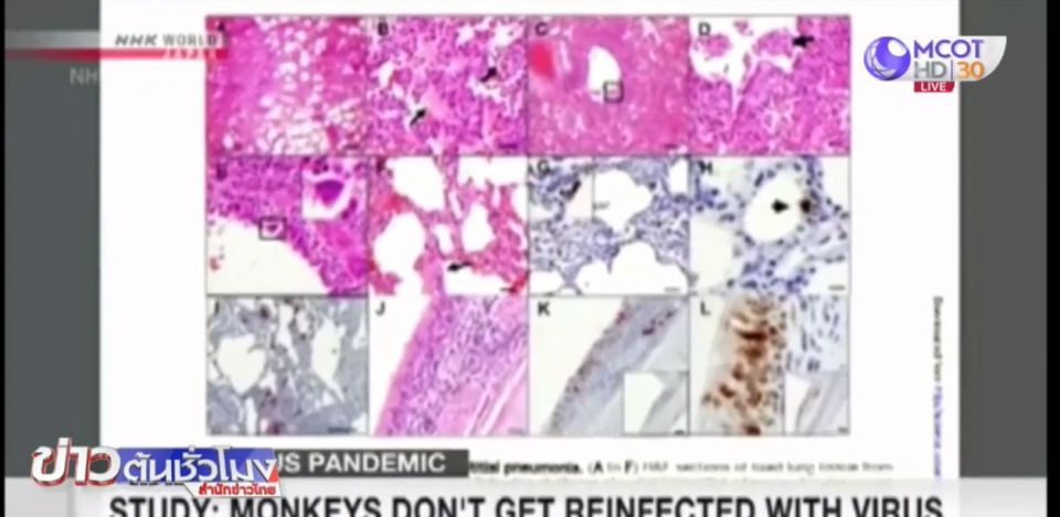 สหรัฐ 21 พ.ค. – นักวิจัยจากคณะแพทยศาสตร์ฮาร์วาร์ด เผยผลวิจับพบลิงที่เคยติดเชื้อไวรัสสายพันธุ์ใหม่ จะไม่ติดเชื้ออีกเป็นครั้งที่ 2 เนื่องจากระบบภูมิคุ้มกันของลิงจะสร้างภูมิต้านทานไวรัสสายพันธุ์ใหม่ขึ้นมา