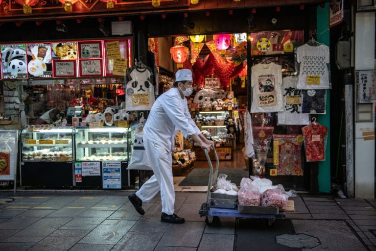 ท้องถนนในญี่ปุ่นโล่งว่างจากที่ผู้คนลดการออกนอกบ้าน แต่ขวักไขว่ด้วยคนที่ขี่จักรยานส่งอาหาร รวมทั้งรถขนส่งสินค้าของบริษัทต่างๆ ที่ได้อานิสงส์จากการสั่งซื้อสินค้าทางออนไลน์ ที่เพิ่มขึ้นอย่างมาก