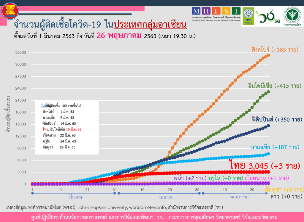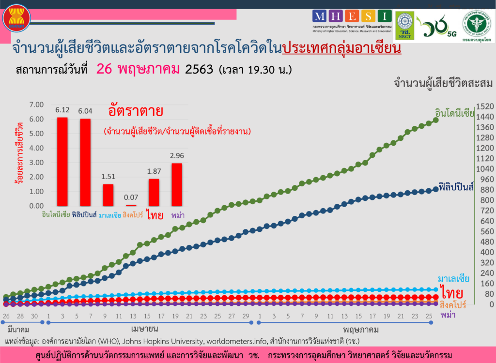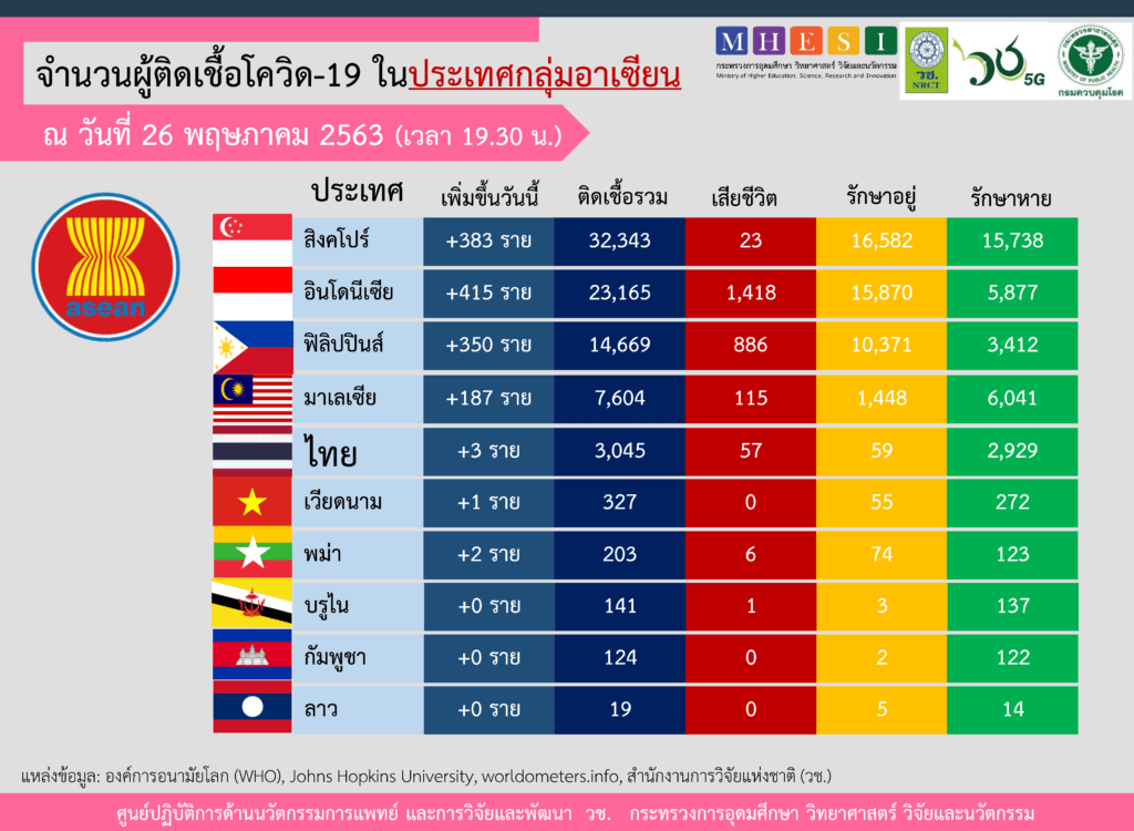 เมื่อวันที่ 26 พฤษภาคม ศูนย์ปฏิบัติการด้านนวัตกรรมการแพทย์ และการวิจัยและพัฒนา สำนักงานการวิจัยแห่งชาติ (วช.) กระทรวงการอุดมศึกษาฯ (อว.) รายงานสถานการณ์การติดเชื้อโควิด-19 ในอาเซียน