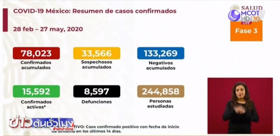 เม็กซิโก 28 พ.ค. -รัฐบาลเม็กซิโกเริ่มเดินหน้าผ่อนปรนมาตรการเข้มงวดเพื่อฟื้นฟูเศรษฐกิจ แต่จำนวนผู้เสียชีวิตจากโควิด-19 ยังเพิ่มขึ้นอย่างต่อเนื่อง พบผู้ติดเชื้อรายใหม่ 3,463 คน เสียชีวิตเพิ่มอีก 463 คน ส่งผลให้มีผู้ติดเชื้อที่ได้รับการยืนยัน 78,023 คน เสียชีวิต 8,597 คน ขณะที่ผู้คนในกรุงเม็กซิโก ซิตี้ จำนวนมากไม่เชื่อมั่นรัฐบาลในการแก้ปัญหาโควิด-19