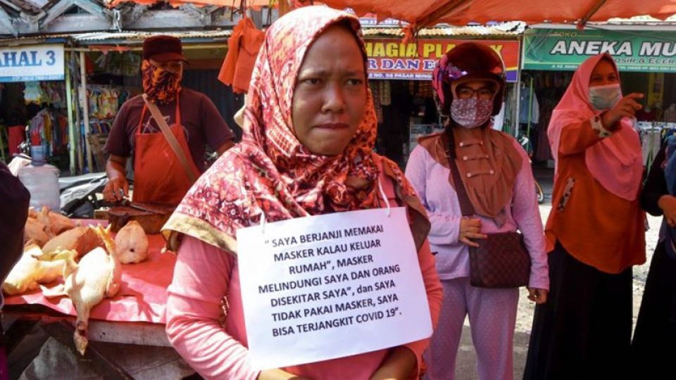 ทหารอินโดนีเซีย 340,000 นายกระจายกำลังตามเมืองต่าง ๆ ตรวจตราการใช้มาตรการรักษาระยะห่างทางสังคม ขณะที่ทางการระดับจังหวัดใช้การรณรงค์ที่แตกต่างกันไป ส่วนใหญ่ใช้การประจานให้ได้อาย ตำรวจจังหวัดเบงกูลู ทางตะวันตกของประเทศส่งกำลังออกตรวจตราผู้ฝ่าฝืน หากพบว่าไม่สวมหน้ากากอนามัยหรือไม่รักษาระยะห่างทางสังคมจะบังคับให้แขวนป้ายประกาศว่าจะปฏิบัติตามในครั้งหน้า พร้อมกับถ่ายรูปแล้วโพสต์ลงในสื่อสังคมออนไลน์เพื่อประจานให้ได้อาย เจ้าหน้าที่เผยว่า คนในจังหวัดยังไม่ตระหนักถึงความสำคัญของการปฏิบัติตามระเบียบ โดยเฉพาะเรื่องการสวมหน้ากากอนามัยและการรวมตัวในที่สาธารณะเป็นกลุ่มใหญ่ ทั้งที่เป็นเรื่องสำคัญต่อตัวเองและคนในครอบครัว ชาวประมงคนหนึ่งถูกลงโทษหลังขึ้นฝั่งเพราะไม่สวมหน้ากากอนามัยขณะล่องเรือหาปลาตามลำพังโอดครวญว่า เป็นเรื่องตลกที่จะสวมหน้ากากอนามัยกลางทะเล และก็ไม่มีระเบียบที่ว่าด้วย หากมีก็จะทำตามแน่นอน