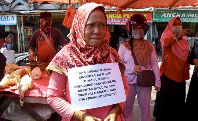 รัฐบาลอินโดนีเซียได้ส่งทหารราว 340,000 นายลงพื้นที่ในกว่า 20 เมืองใหญ่ทั่วประเทศ เพื่อดูแลการบังคับใช้มาตรการสกัดกั้นการแพร่เชื้อ COVID-19 เช่น การสวมหน้าอนามัยในที่สาธารณะ แต่ก็มีผู้นำจังหวัดบางคนที่พยายามคิดค้นวิธีการใหม่ๆ มาต่อสู้โรคระบาด