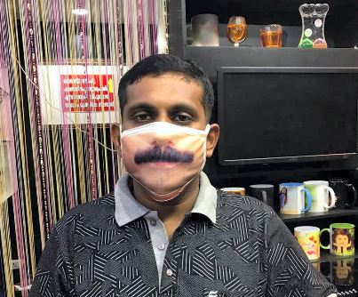 “บิเนช จี พอล” อายุ 38 ปี ศิลปินดิจิทัลในรัฐเกรละ คิดค้นวิธีการให้ผู้คนสามารถใส่หน้ากากอนามัยต่อไป โดยไม่ต้องละทิ้งอัตลักษณ์บนใบหน้าของตัวเอง ด้วยการพิมพ์ภาพใบหน้าครึ่งล่างลงบนหน้ากากอนามัย
