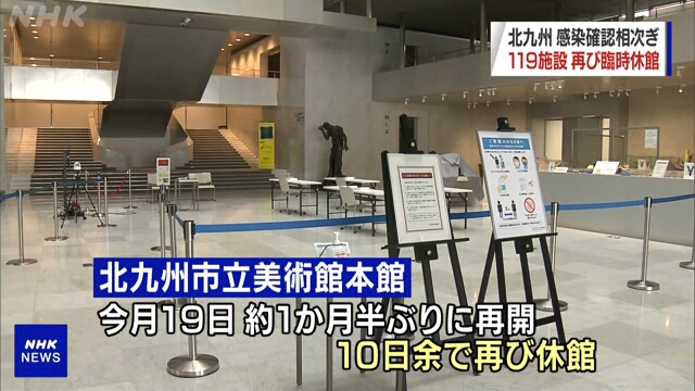 หนึ่งในสถานที่ที่ปิดให้บริการในวันอาทิตย์ที่ 31 คือ พิพิธภัณฑสถานศิลปะแห่งเทศบาลเมืองคิตาคิวชูซึ่งเพิ่งเปิดให้บริการได้อีกครั้งหนึ่งเมื่อ 12 วันก่อนหลังปิดให้บริการมาราวหนึ่งเดือนครึ่ง