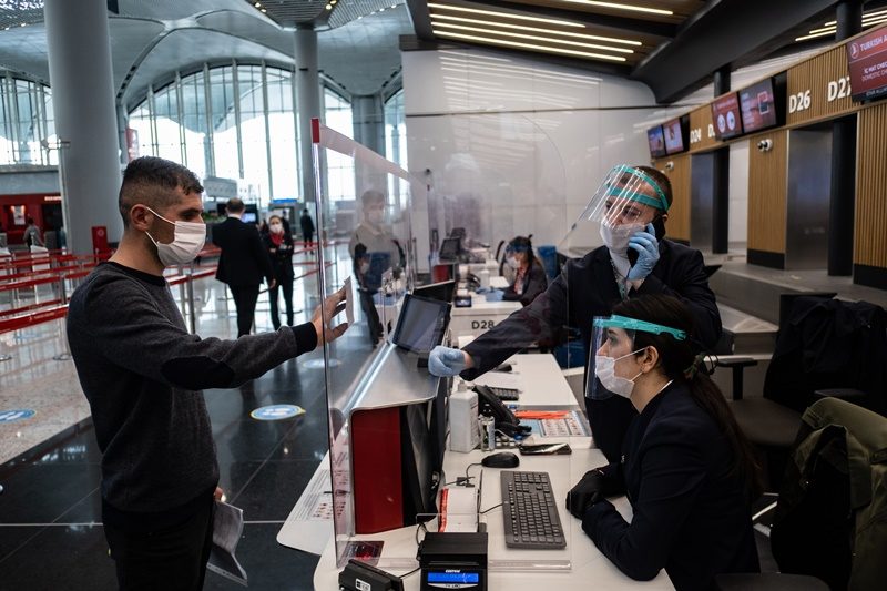 ขณะที่อาคารผู้โดยสารจะต้องจำกัดจำนวนผู้โดยสารและคนที่เดินทางร่วมด้วย เช่นผู้ที่ต้องดูแลผู้โดยสารที่พิการ และเจ้าหน้าที่ของสนามบิน