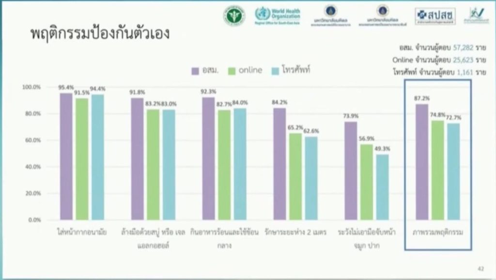 นอกจากนี้ นพ.ทวีศิลป์ กล่าวว่า การสำรวจของกรมควบคุมโรค ร่วมกับ องค์การอนามัยโลก มหาวิทยาลัยมหิดล สำนักงานหลักประกันสุขภาพแห่งชาติ (สปสช.) และสำนักงานสถิติแห่งชาติ สำรวจใน 3 กลุ่ม คือ 1.อาสาสมัครสาธารณสุขประจำหมู่บ้าน (อสม.) จำนวน 57,282 ราย 2.ระบบออนไลน์ จำนวน 25,623 ราย และ 3.ทางโทรศัพท์ 1,161 ราย พบว่า กลุ่ม อสม.มีภาพรวมพฤติกรรมสุขภาพในการป้องกันโรคดีที่สุด สูงถึงร้อยละ 87.2 กลุ่มสำรวจออนไลน์ ร้อยละ 74.8 และ กลุ่มสำรวจทางโทรศัพท์ ร้อยละ 72.7