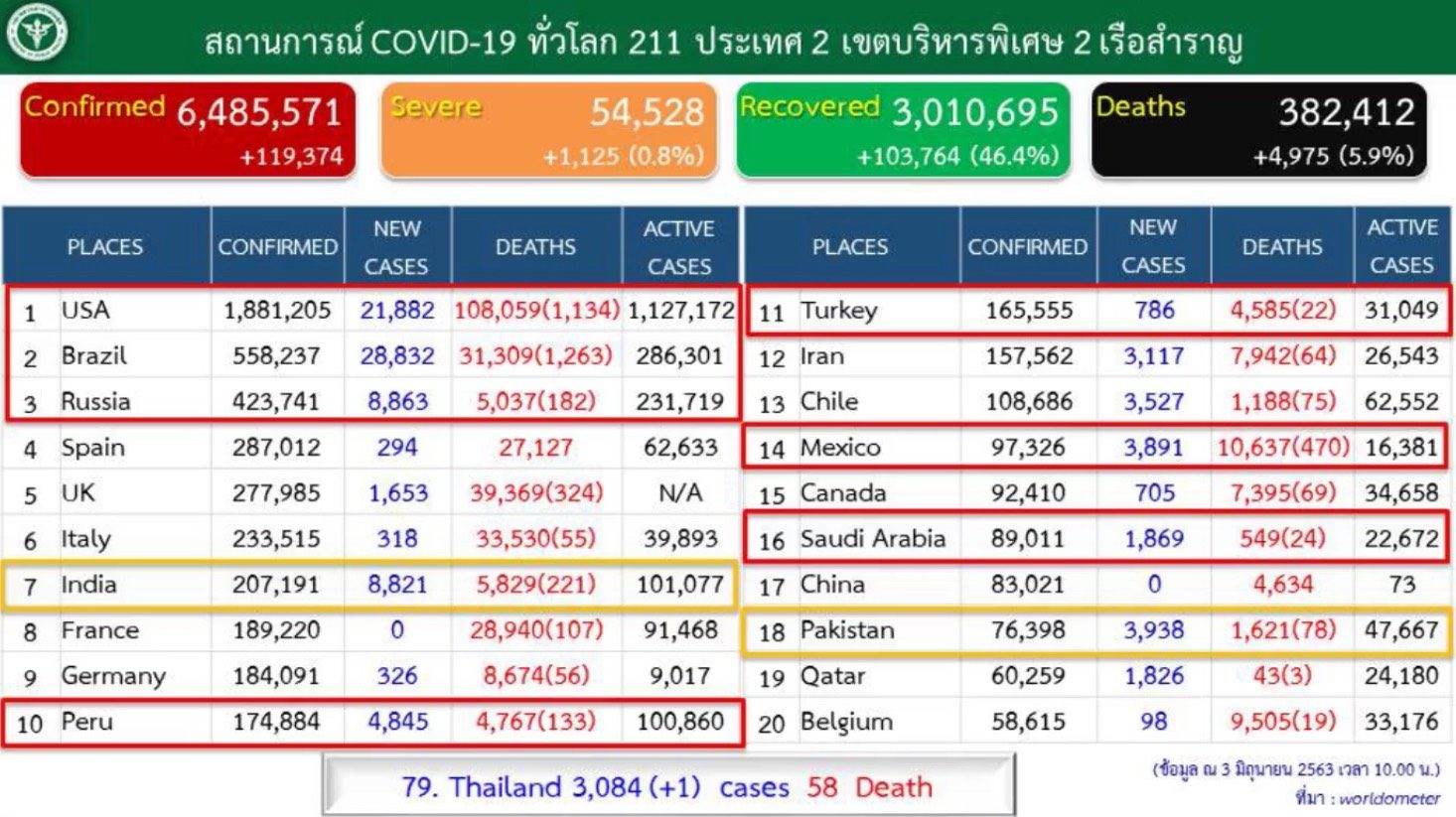 เมื่อวันที่ 3 มิถุนายน ที่กระทรวงสาธารณสุข (สธ.) พญ.พรรณประภา ยงค์ตระกูล ผู้ช่วยโฆษกศูนย์บริหารสถานการณ์การแพร่ระบาดของโรคติดเชื้อไวรัสโคโรนา 2019 (โควิด-19) (ศบค.) เปิดเผยระหว่างแถลงความคืบหน้าสถานการณ์โรคติดเชื้อไวรัสโคโรนา 2019 หรือ โควิด-19 ว่า สถานการณ์ทั่วโลกใน 211 ประเทศ ประเทศไทยอยู่ในลำดับที่ 79 และพบผู้ป่วยยืนยันการติดเชื้อทั่วโลกสะสมรวม 6,485,571 ราย รักษาหายแล้ว 3,010,695 ราย เสียชีวิต 382,412 ราย