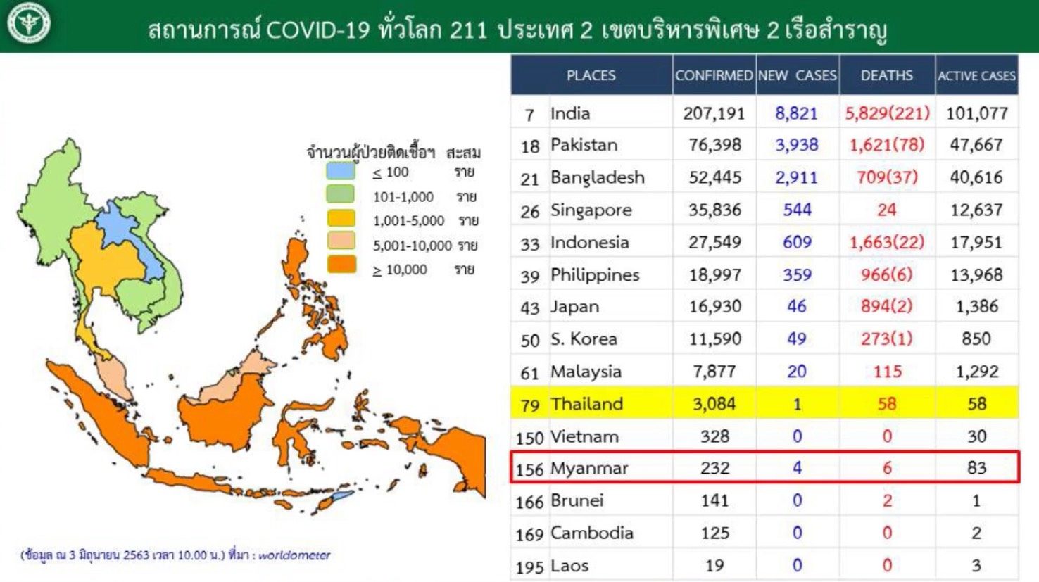 พญ.พรรณประภา กล่าวว่า ส่วนสถานการณ์ในกลุ่มประเทศเอเชีย จำนวน 15 ประเทศ เรียงลำดับตามจำนวนยอดผู้ป่วยสะสม ได้แก่ 1.อินเดีย ผู้ป่วยสะสม 207,191 ราย เสียชีวิต 5,829 ราย 2.ปากีสถาน ผู้ป่วยสะสม 76,398 ราย เสียชีวิต 1,621 ราย 3.บังกลาเทศ ผู้ป่วยสะสม 52,445 ราย เสียชีวิต 709 ราย 4.สิงคโปร์ ผู้ป่วยสะสม 35,836 ราย เสียชีวิต 24 ราย 5.อินโดนีเซีย ผู้ป่วยสะสม 27,549 ราย เสียชีวิต 1,663 ราย 6.ฟิลิปปินส์ ผู้ป่วยสะสม 18,997 ราย เสียชีวิต 966 ราย 7.ญี่ปุ่น ผู้ป่วยสะสม 16,930 ราย เสียชีวิต 894 ราย 8.เกาหลีใต้ ผู้ป่วยสะสม 11,590 ราย เสียชีวิต 273 ราย 9.มาเลเซีย ผู้ป่วยสะสม 7,877 ราย เสียชีวิต 115 ราย 10.ไทย ผู้ป่วยสะสม 3,084 เสียชีวิต 58 ราย 11.เวียดนาม ผู้ป่วยสะสม 328 ราย เสียชีวิต 0 ราย 12.เมียนมา ผู้ป่วยสะสม 232 ราย เสียชีวิต 6 ราย 13.บรูไน ผู้ป่วยสะสม 141 ราย เสียชีวิต 2 ราย 14.กัมพูชา ผู้ป่วยสะสม 125 ราย เสียชีวิต 0 ราย และ 15.สาธารณรัฐประชาชนลาว ผู้ป่วยสะสม 19 ราย เสียชีวิต 0 ราย