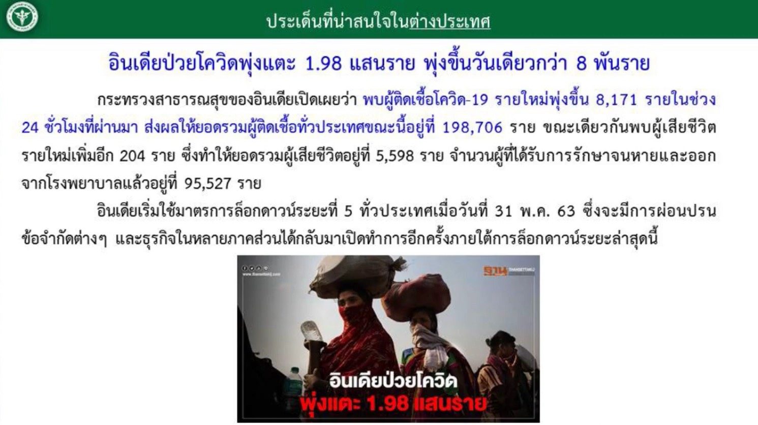 “ประเด็นที่น่าสนใจในต่างประเทศ คือ 1.อินเดีย โดยกระทรวงสาธารณสุขของอินเดีย เปิดเผยว่า พบผู้ติดเชื้อโควิด-19 รายใหม่พุ่งขึ้น 8,171 รายในช่วง 24 ชั่วโมงที่ ส่งผลให้ยอดรวมผู้ติดเชื้อทั่วประเทศขณะนี้อยู่ที่ 198,706 ราย พบผู้เสียชีวิตรายใหม่เพิ่มอีก 204 ราย ซึ่งทำให้ยอดรวมผู้เสียชีวิตอยู่ที่ 5,598 ราย จำนวนผู้ที่ได้รับการรักษาจนหายและออกจากโรงพยาบาลแล้วอยู่ที่ 95,527 ราย และอินเดียเริ่มใช้มาตรการล็อกดาวน์ระยะที่ 5 ทั่วประเทศ เมื่อวันที่ 31 พฤษภาคม ซึ่งจะมีการผ่อนปรนข้อจำกัดต่างๆ และธุรกิจในหลายภาคส่วนได้กลับมาเปิดทำการอีกครั้งภายใต้การล็อกดาวนระยะล่าสุดนี้” พญ.พรรณประภา กล่าว