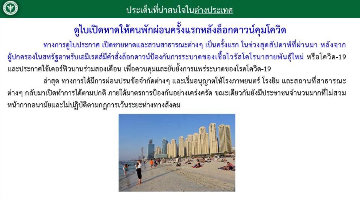 นอกจากนี้ พญ.พรรณประภา กล่าวว่า ดูไบ เปิดหาดให้คนพักผ่อนครั้งแรกหลังล็อกดาวน์คุมโควิด-19 โดยทางการดูไบประกาศเปิดชายหาดและสวนสาธารณะต่างๆ เป็นครั้งแรก ในช่วงสุดสัปดาห์ที่ผ่านมา หลังจากผู้ปกครองในสหรัฐอาหรับเอมิเรตส์มีคำสั่งล็อกดาวน์และประกาศใช้เคอร์ฟิวนานร่วม 2 เดือน โดยล่าสุด ทางการได้มีการผ่อนปรนข้อจำกัดต่งๆ และเริ่มอนุญาตให้โรงภาพยนตร์ โรงยิม และสถานที่สาธารณะต่างๆ กลับมาเปิดทำการได้ตามปกติ ภายใต้มาตรการป้องกันอย่างเคร่งครัด