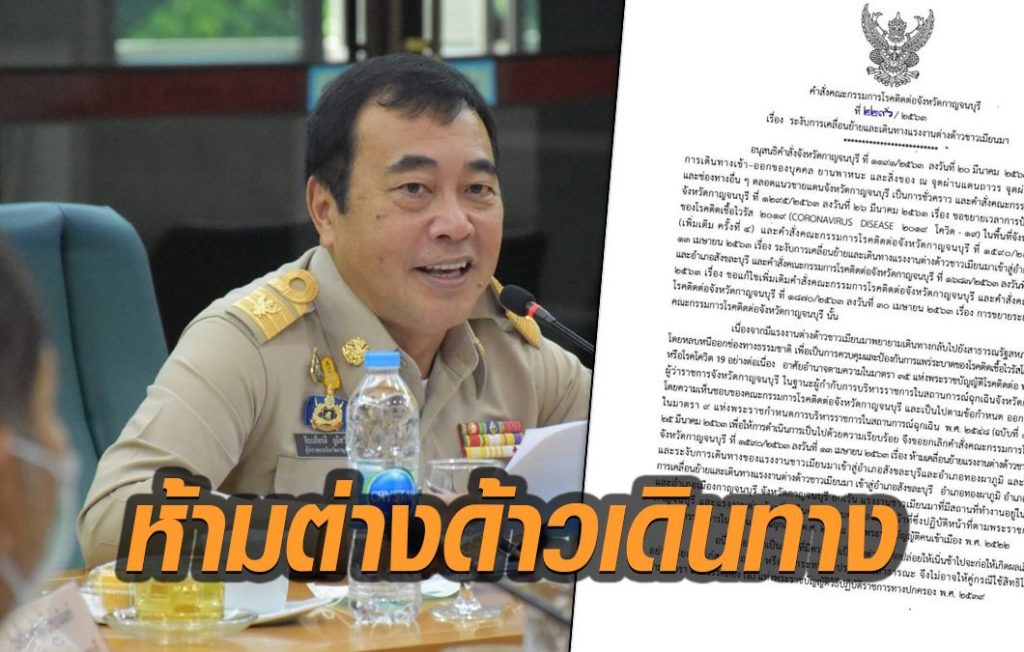 ผู้ว่าฯ กาญจน์ ออกคำสั่งห้ามเคลื่อนย้ายและระงับการเดินทางเข้า-ออก ของแรงงานชาวเมียนมา ไปพื้นที่ อ.สังขละบุรี ทองผาภูมิ ไทรโยค และเมือง เหตุพบแรงงานพยายามหลบหนีออกช่องทางธรรมชาติเพื่อป้องกันการแพร่ระบาดของเชื้อไวรัสโควิด-19