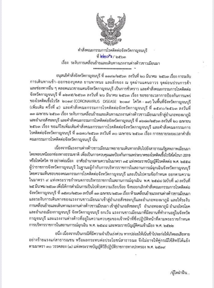 เนื่องจากมีแรงงานต่างด้าวชาวเมียนมาพยายามเดินทางกลับไปยังสาธารณรัฐสหภาพเมียนมาโดยหลบหนีออกช่องทางธรรมชาติ เพื่อเป็นการควบคุมและป้องกันการแพร่ระบาดของโรคติดเชื้อไวรัสโคโรนา 2019 หรือโรคโควิด 19 อย่างต่อเนื่อง อาศัยอำนาจความในมาตรา 35 แห่งพระราชบัญญัติโรคติดต่อ พ.ศ.2558 ผู้ว่าราชการจังหวัดกาญจนบุรี ในฐานะผู้กำกับการบริหารราชการในสถานการณ์ฉุกเฉินจังหวัดกาญจนบุรี โดยความเห็นชอบของคณะกรรมการโรคติดต่อจังหวัดกาญจนบุรี และเป็นไปตามข้อกำหนด ออกตามความในมาตรา 9 แห่งพระราชกำหนดการบริหารราชการในสถานการณ์ฉุกเฉิน พ.ศ.2548 (ฉบับที่ 1) ลงวันที่ 25 มีนาคม 2563 เพื่อให้การดำเนินการเป็นไปด้วยความเรียบร้อย จึงขอยกเลิกคำสั่งคณะกรรมการโรคติดต่อจังหวัดกาญจนบุรี ที่ 1590/2563 ลงวันที่ 13 เมษายน 2563 เรื่องห้ามเคลื่อนย้ายแรงงานต่างด้าวชาวเมียนมาและระงับการเดินทางของแรงงานชาวเมียนมาเข้าสู่อำเภอสังขละบุรี อำเภอทองผาภูมิ และให้ระงับการเคลื่อนย้ายและเดินทางแรงงานต่างด้าวชาวเมียนมาสู่อำเภอสังขละบุรี อำเภอทองผาภูมิ อำเภอไทรโยค และอำเภอเมืองจังหวัดกาญจนบุรี จ.กาญจนบุรี ยกเว้น แรงงานชาวเมียนมาที่มีสถานที่ทำงานอยู่ในจ.กาญจนบุรี และแรงงานต่างด้าวที่อยู่ในความควบคุมของเจ้าหน้าที่ซึ่งปฏิบัติหน้าที่ตามพระราชกำหนดการบริหารราชการในสถานการณ์ฉุกเฉิน พ.ศ.2548 และพระราชบัญญัติคนเข้าเมือง พ.ศ.2522