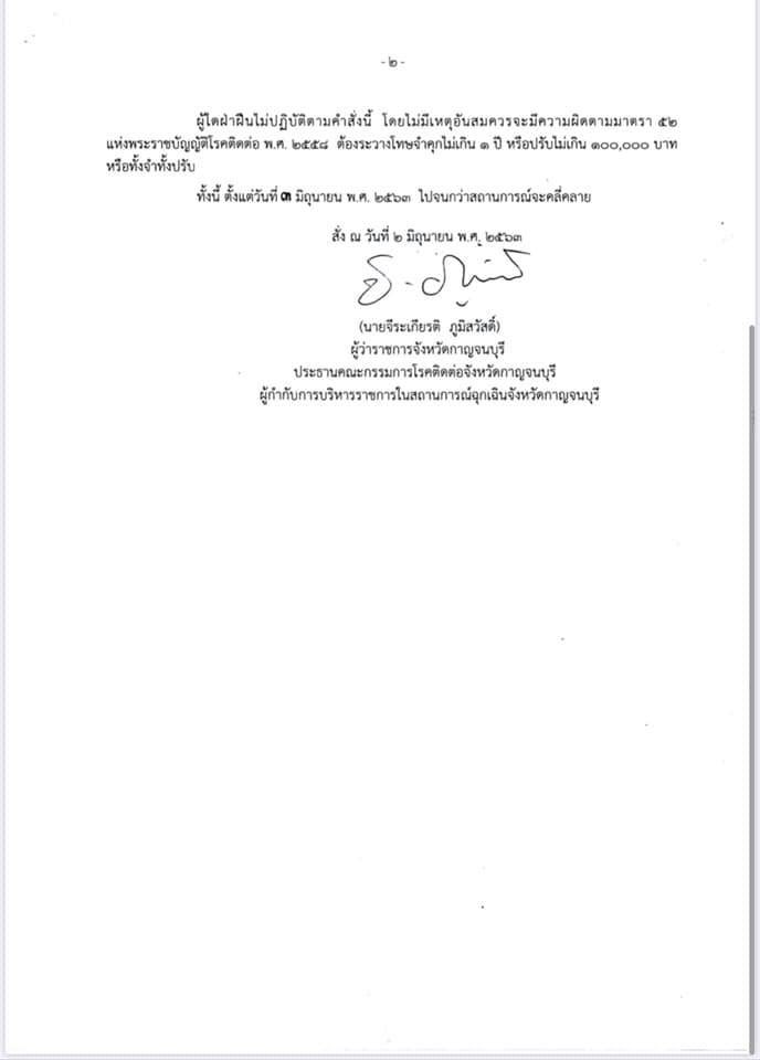 เมื่อวันที่ 3 มิถุนายน นายจีระเกียรติ ภูมิสวัสดิ์ ผู้ว่าราชการจังหวัดกาญจนบุรี ได้ออกประกาศคำสั่งคณะกรรมการโรคติดต่อจังหวัดกาญจนบุรี ที่ 2296/2563 เรื่อง ระงับการเคลื่อนย้ายและเดินทางแรงงานต่างด้าวชาวเมียนมา ใจความว่า อนุสนธิคำสั่งจังหวัดกาญจนบุรี ที่ 1191/2563 ลงวันที่ 20 มีนาคม 2563 เรื่องการระงับการเดินทางเข้า-ออกของบุคคล ยานพาหนะ และสิ่งของ ณ จุดผ่านแดนถาวร จุดผ่อนปรนการค้าและช่องทางอื่นๆ ตลอดแนวชายแดนจ.กาญจนบุรี เป็นการชั่วคราว และคำสั่งคณะกรรมการโรคติดต่อจ.กาญจนบุรี ที่ 1295/2563 ลงวันที่ 26 มีนาคม 2563 เรื่อง ขอขยายเวลาการป้องกันการแพร่ของโรคติดเชื้อไวรัส 2019 (CORONAVIRUS DISEASE 2019 โควิด-19) ในพื้นที่จ.กาญจนบุรี (เพิ่มเติม ครั้งที่ 4) และคำสั่งคณะกรรมการโรคติดต่อจังหวัดกาญจนบุรี ที่ 1590/2563 ลงวันที่ 13 เมษายน 2563 เรื่อง ระงับการเคลื่อนย้ายและเดินทางแรงงานต่างด้าวชาวเมียนมาเข้าสู่อ.ทองผาภูมิและอ.สังขละบุรี และคำสั่งคณะกรรมการโรคติดต่อจ.กาญจนบุรี ที่ 1683/2563 ลงวันที่ 13 เมษายน 2563 เรื่อง ระงับการเคลื่อนย้ายและเดินทางแรงงานต่างด้าวชาวเมียนมาเข้าสู่อ.ทองผาภูมิ และอ.สังขละบุรี และคำสั่งคณะกรรมการโรคติดต่อจ.กาญจนบุรีที่ 1683/2563 ลงวันที่ 20 เมษายน 2563 เรื่องขอแก้ไขเพิ่มเติมคำสั่งคณะกรรมการโรคติดต่อจังหวัดกาญจนบุรี และคำสั่งคณะกรรมการโรคติดต่อจ.กาญจนบุรี ที่ 1870/2563 ลงวันที่ 30 เมษายน 2563 เรื่อง การขยายระยะเวลาคำสั่งคณะกรรมการโรคติดต่อจ.กาญจนบุรีนั้น