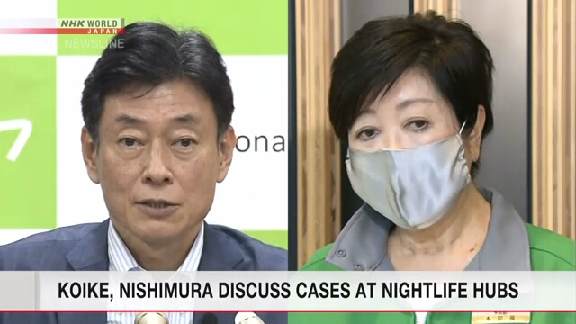 นางโคอิเกะ ยูริโกะ ผู้ว่าการกรุงโตเกียว และนายนิชิมูระ ยาซูโตชิ รัฐมนตรีที่ดูแลด้านการฟื้นฟูเศรษฐกิจของญี่ปุ่น พบกันเมื่อวันอาทิตย์ที่ 7 มิถุนายน หลังจากมีกรณีติดเชื้อไวรัสดังกล่าวเพิ่มขึ้นช่วงไม่นานมานี้ ในย่านสถานบันเทิงกลางคืนของกรุงโตเกียว