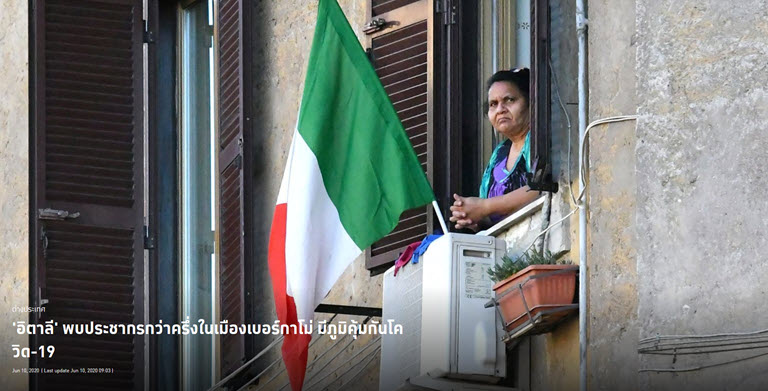 รายงานจากหน่วยงานสาธารณสุขของอิตาลีเมื่อวันจันทร์( 8มิ.ย. ) ที่ผ่านมาระบุว่า ประชาชนในเมืองเบอร์กาโม่ ทางตอนเหนือของอิตาลีมากกว่าครึ่งนั้นมีภูมิคุ้มกันเชื้อไวรัสโคโรนา SARS-CoV-2 หรือเชื้อโควิด-19
