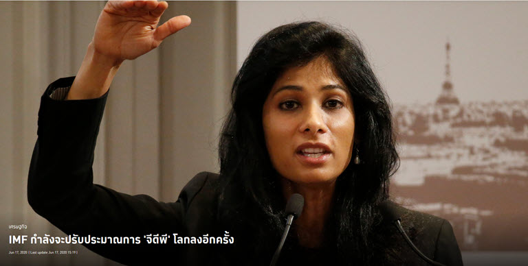 บทความชิ้นล่าสุด ตีพิมพ์เมื่อ 16 มิ.ย.ที่ผ่านมาผ่านเว็บไซต์ของกองทุนการเงินระหว่างประเทศ (ไอเอ็มเอฟ) ของ กิตา โกปิเนธ ที่ปรึกษาด้านเศรษฐศาสตร์และผู้อำนวยการฝ่ายงานวิจัย ไอเอ็มเอฟ สะท้อนความกังวลอย่างชัดเจนต่อสถานการณ์เศรษฐกิจโลกที่จะหดตัวแย่กว่าประมาณการครั้งก่อน ซึ่งเธอเคยพูดว่าการล็อกดาวน์ครั้งนี้ “ย้ำแย่ที่สุดนับตั้งแต่สมัยของภาวะเศรษฐกิจตกต่ำครั้งใหญ่ (Great Depression) และแย่กว่าวิกฤตการเงินไปมากแล้ว” พร้อมตัวเลขอัตราการเติบโตของเศรษฐกิจโลกที่จะติดลบถึงร้อยละ 3